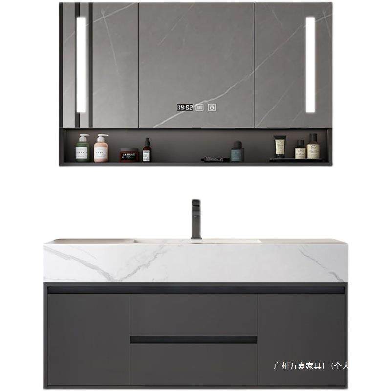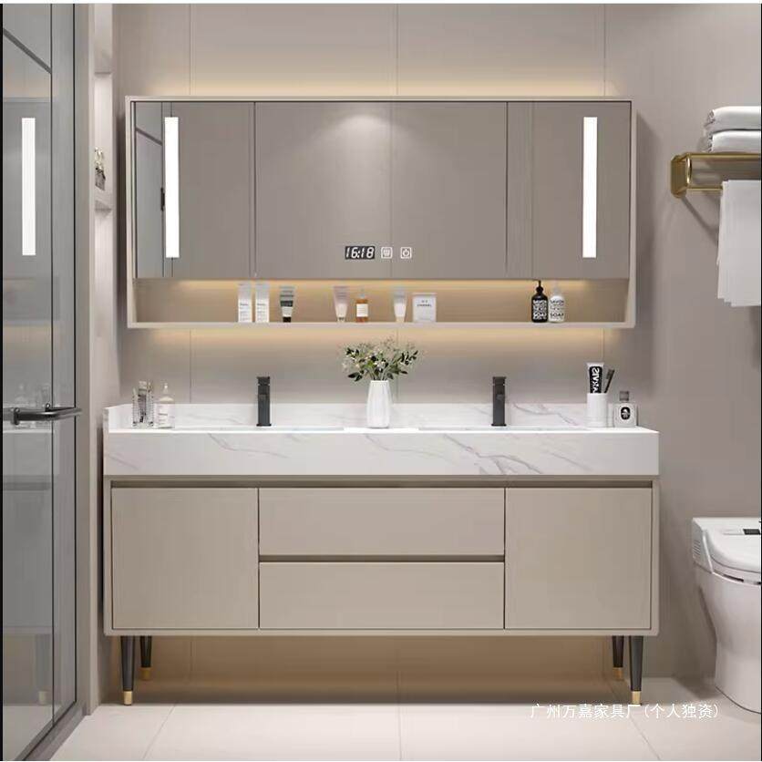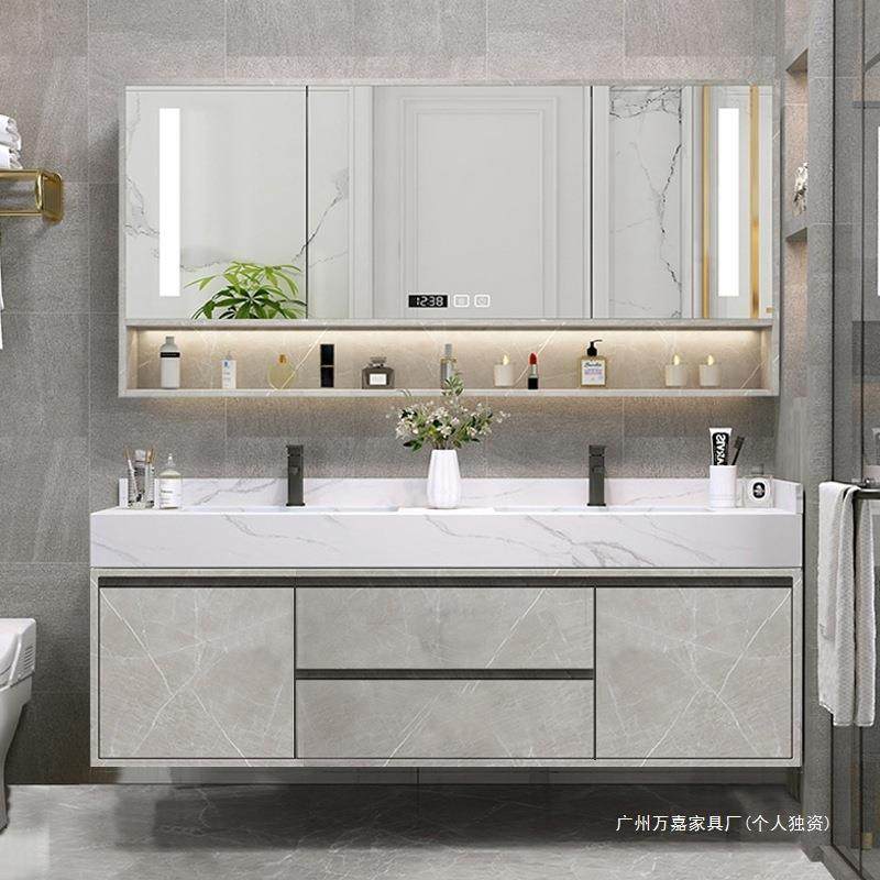 智能镜柜岩板热弯一体无缝陶瓷双盆浴室柜组合可丽耐一体盆洗脸柜