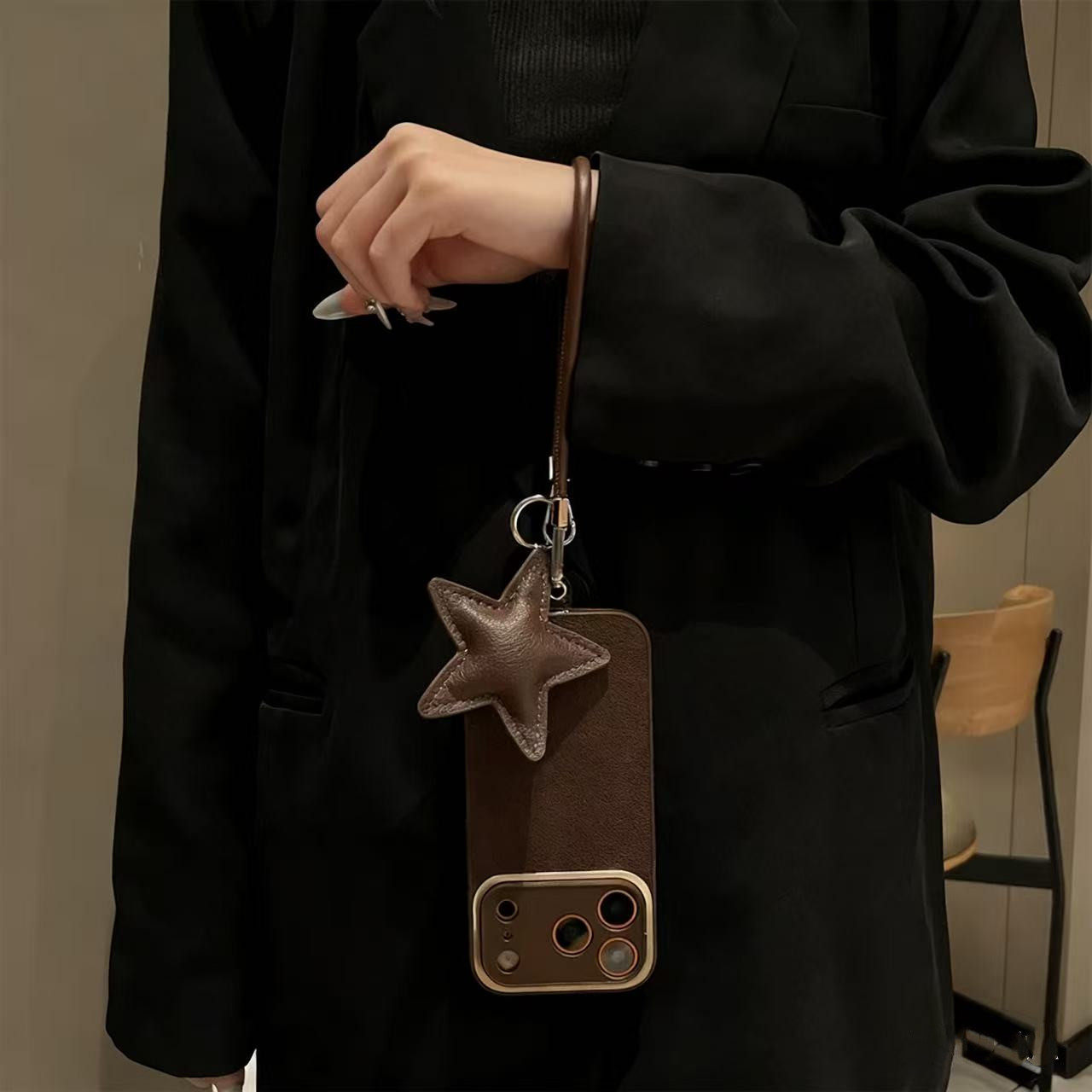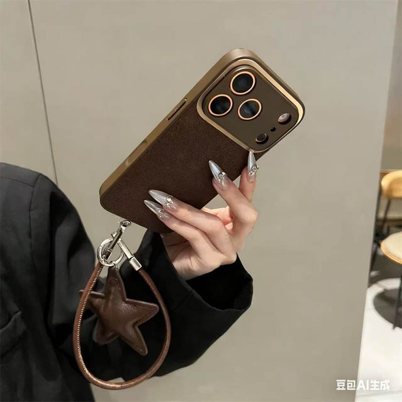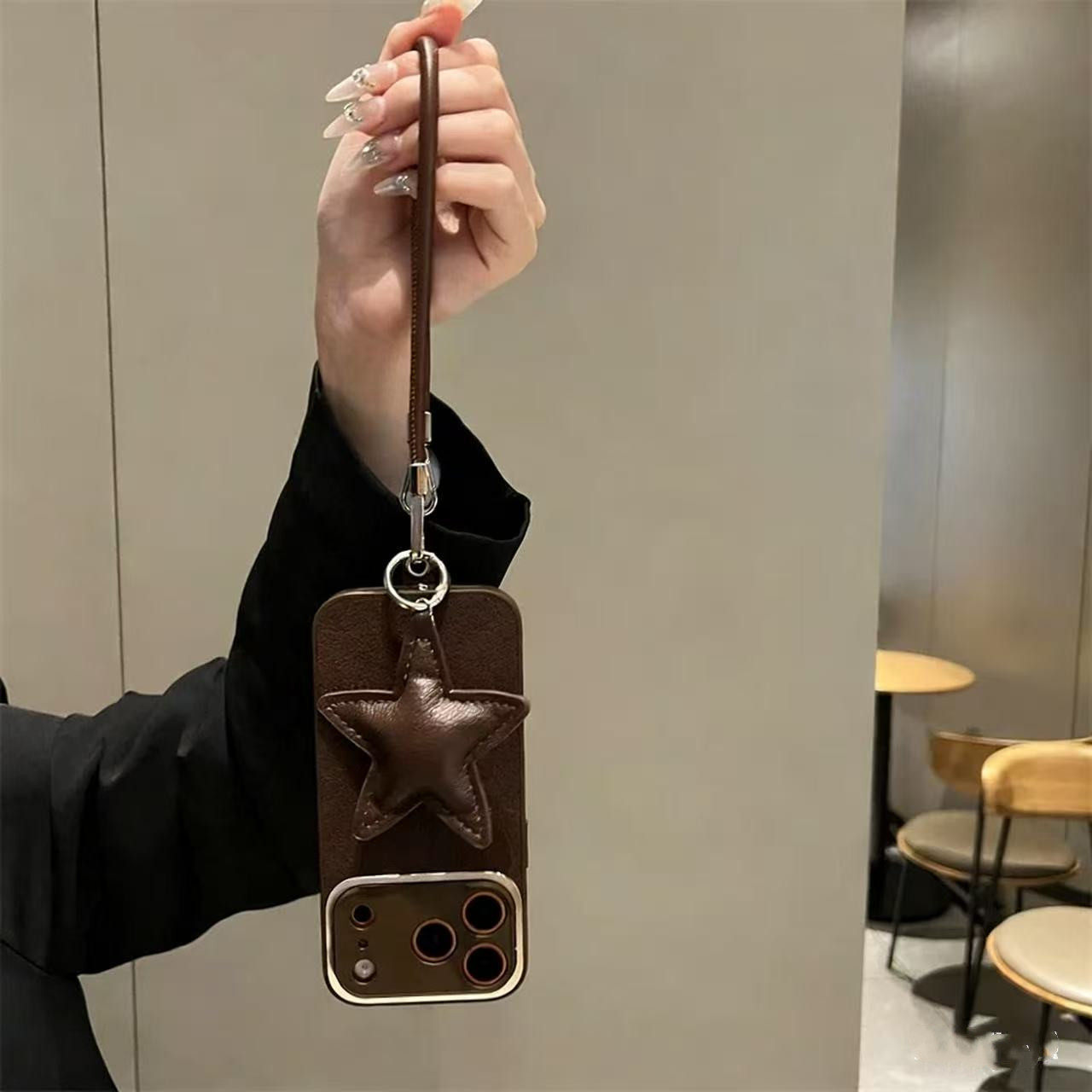 深棕色月坑纹皮质星星挂件适用iPhone17ProMax手机壳苹果16斜跨15新款13华为mate70挂绳p80荣耀400全包防摔女