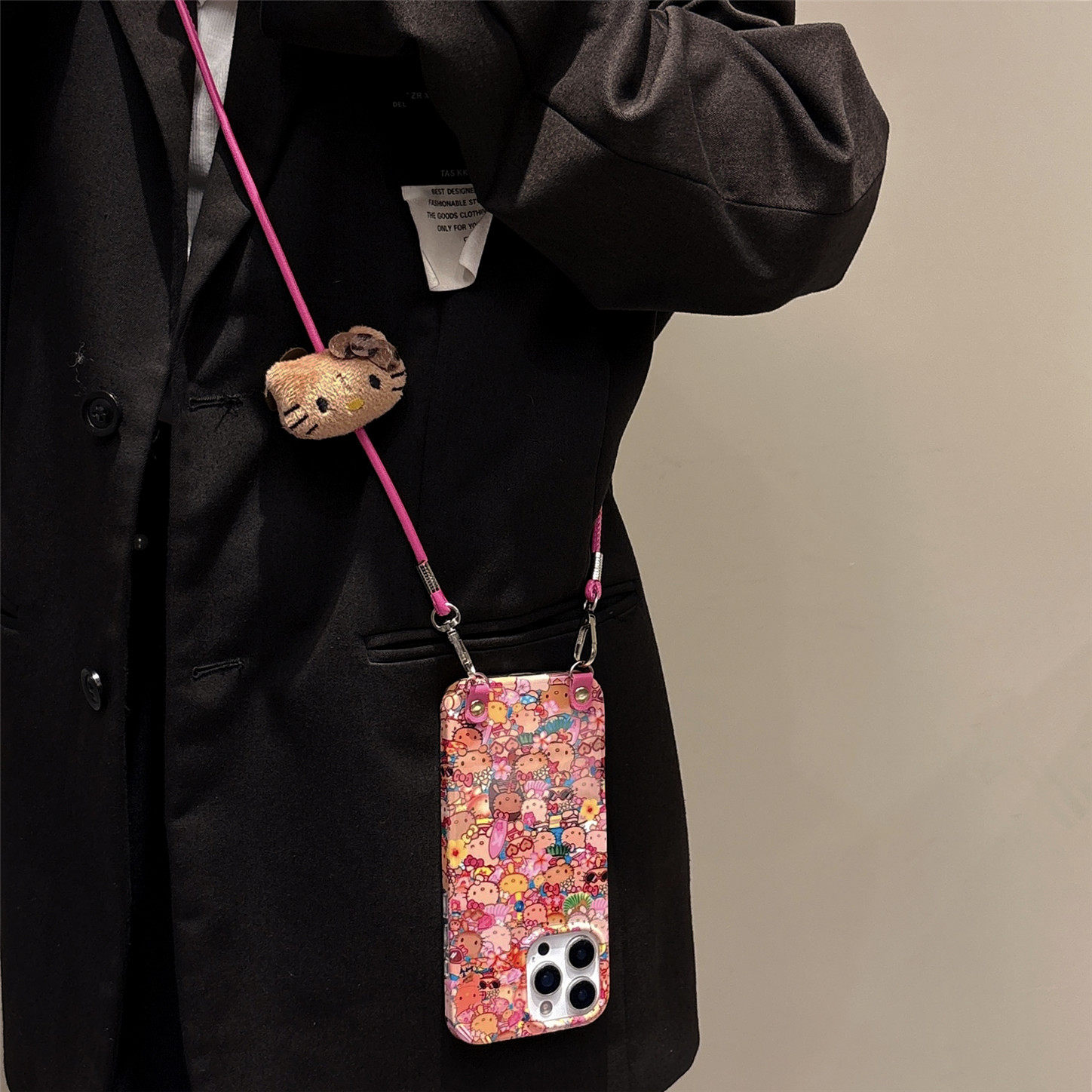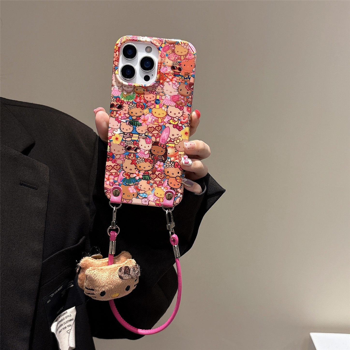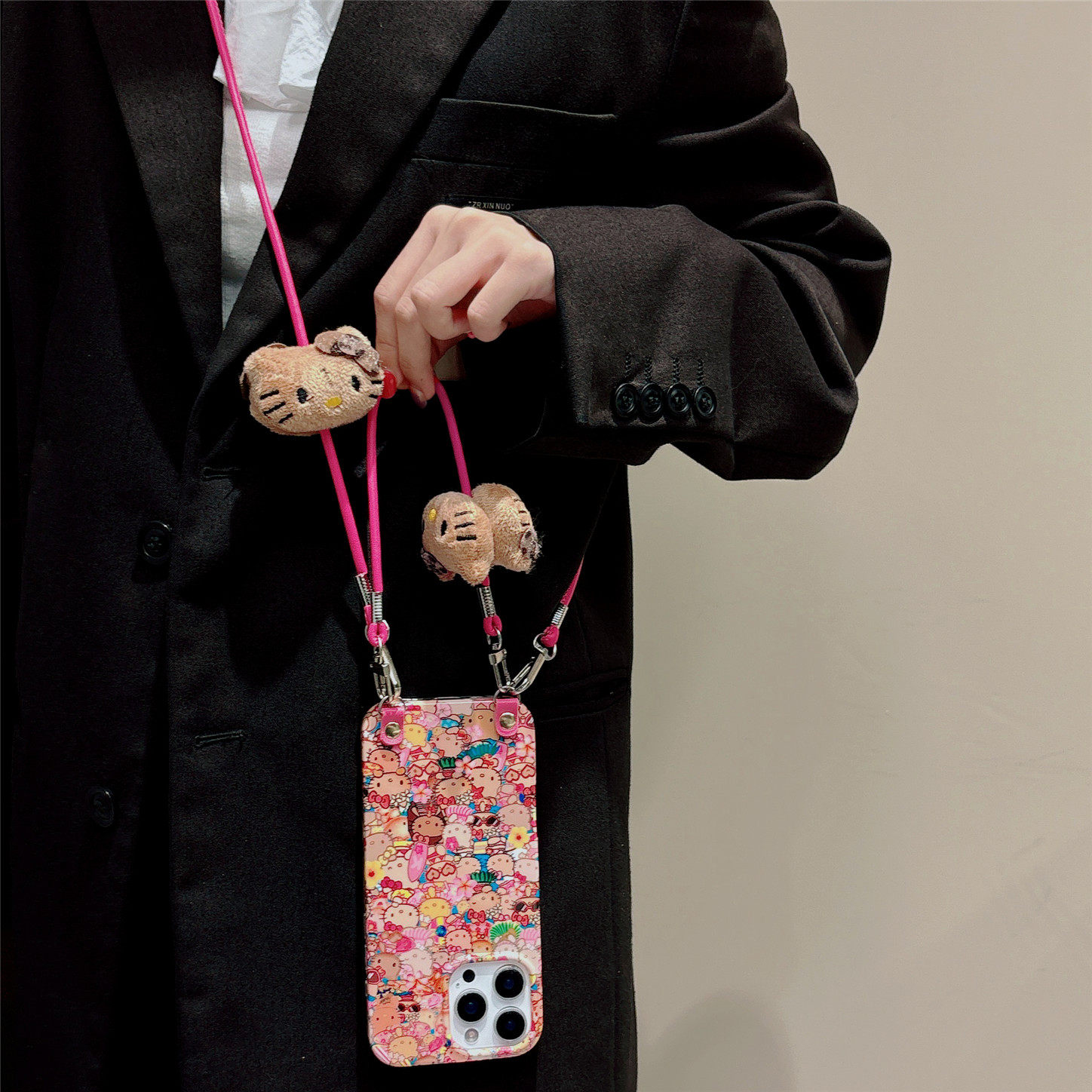 夏日度假风黑皮kt猫适用苹果16promax手机壳新款iphone15斜跨14pro可背挂绳13高级感ip17网红女款小众防摔壳