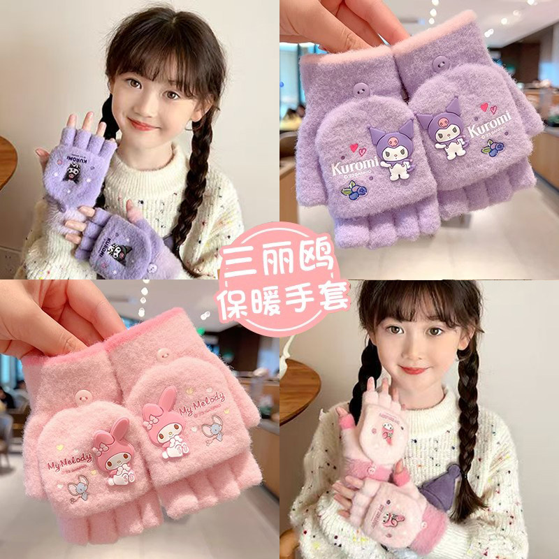 儿童手套秋冬季保暖可爱小孩卡通库洛米女童半指翻盖宝宝五指写字
