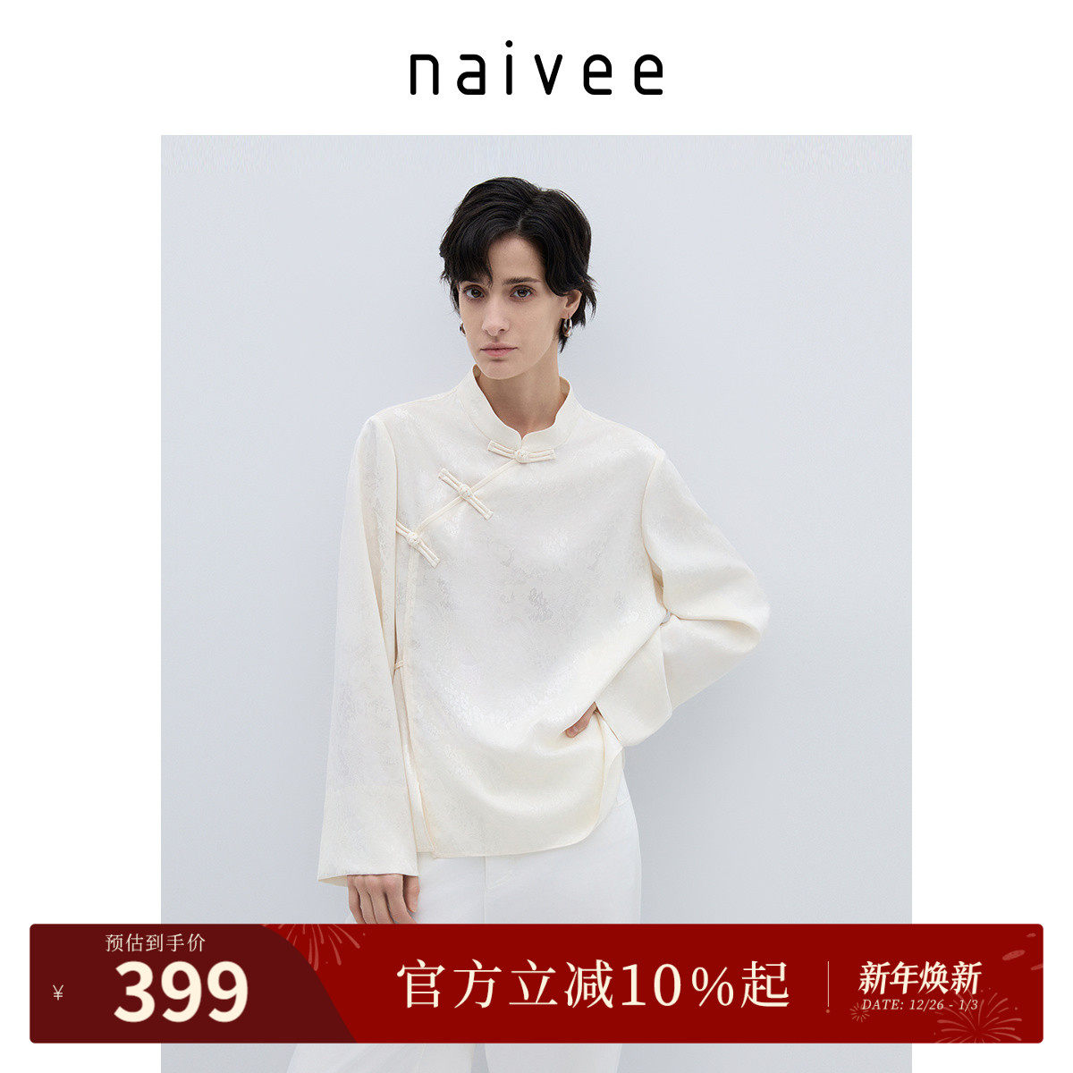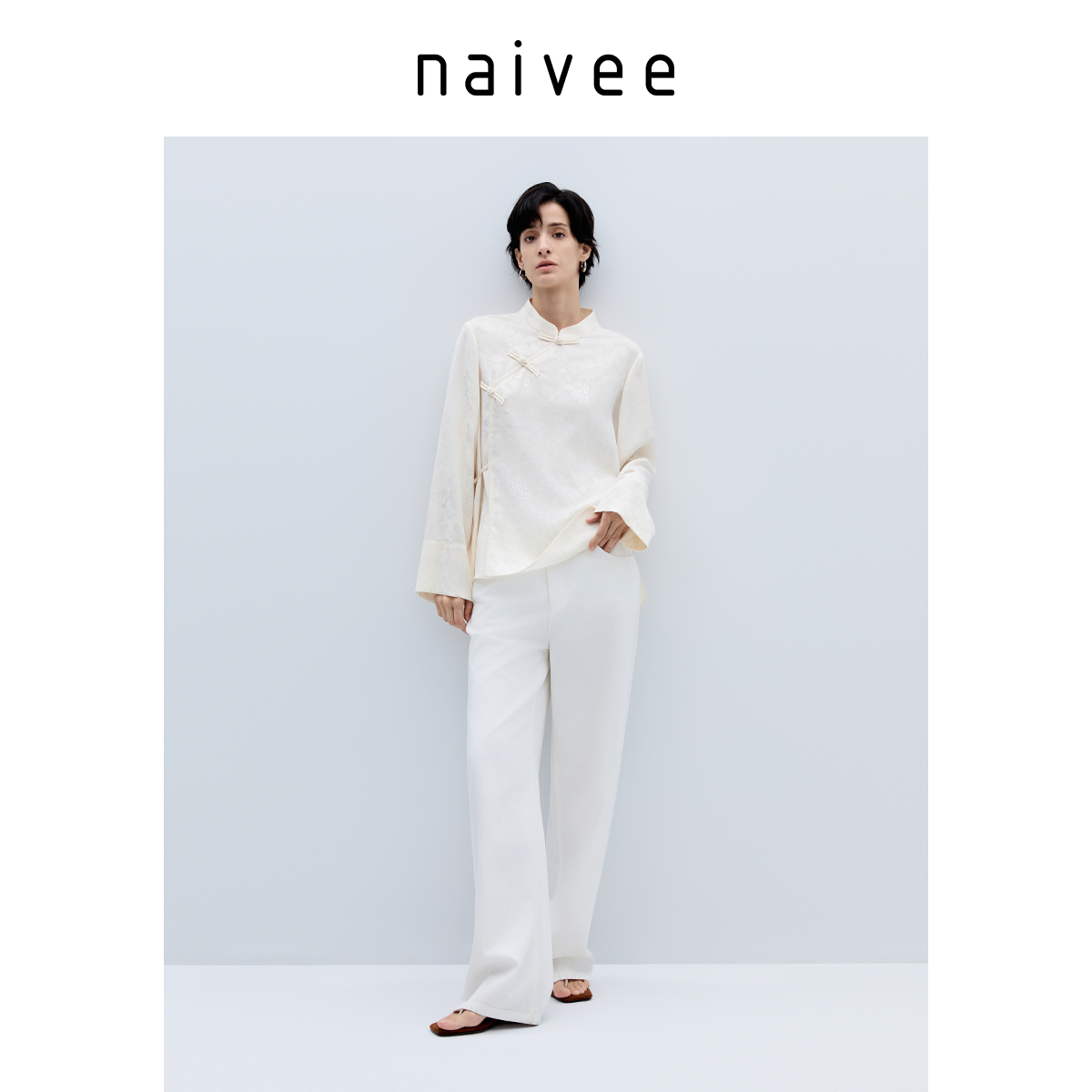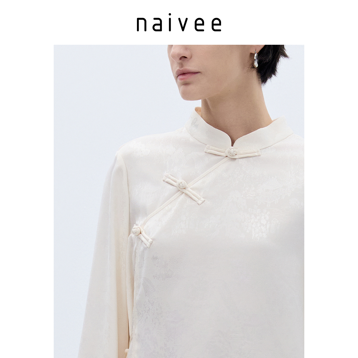 醋酸国风衬衫』naivee纳薇25秋新中式立领长袖上衣女缎面提花盘扣