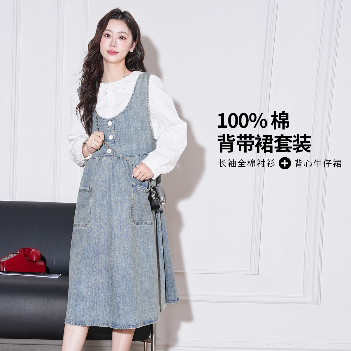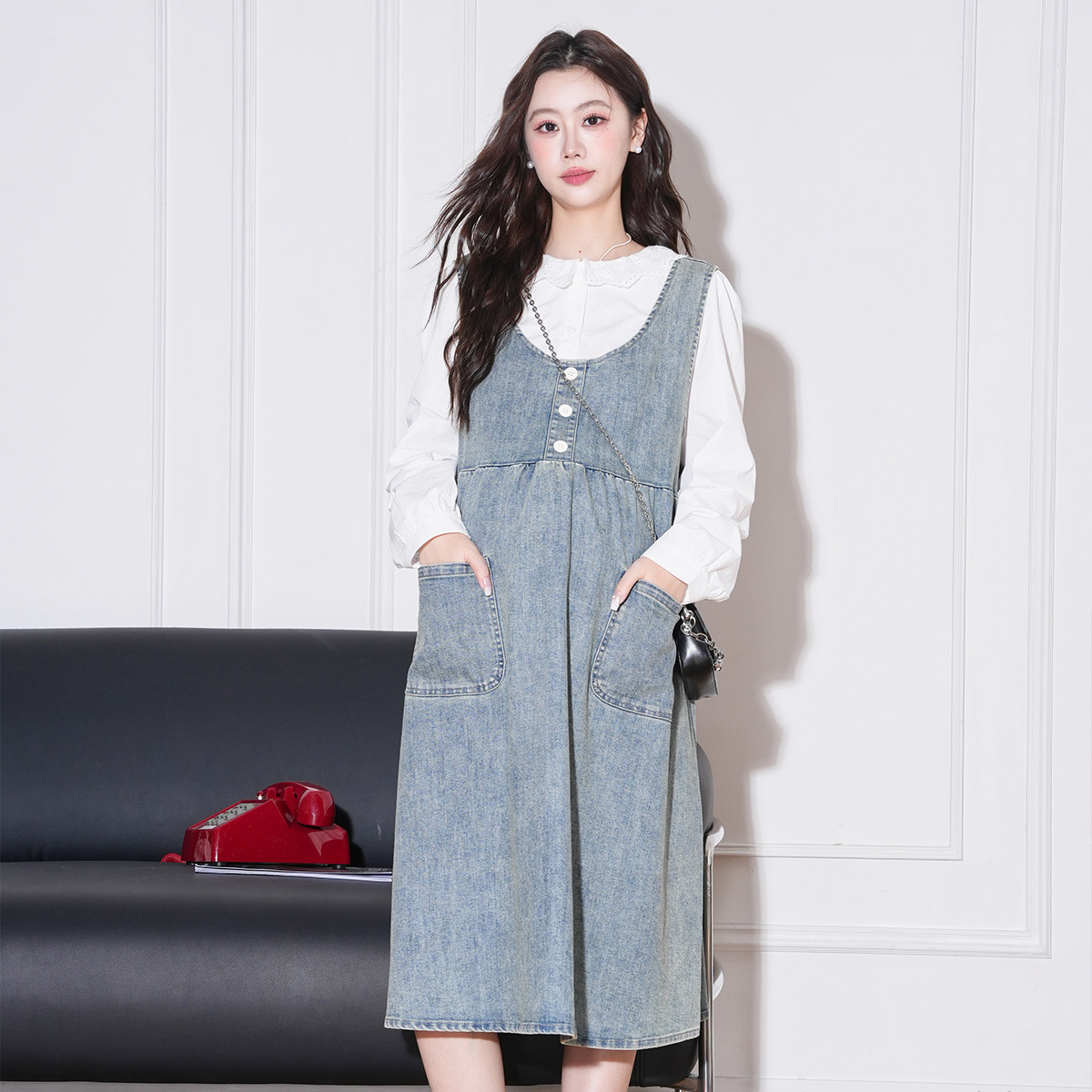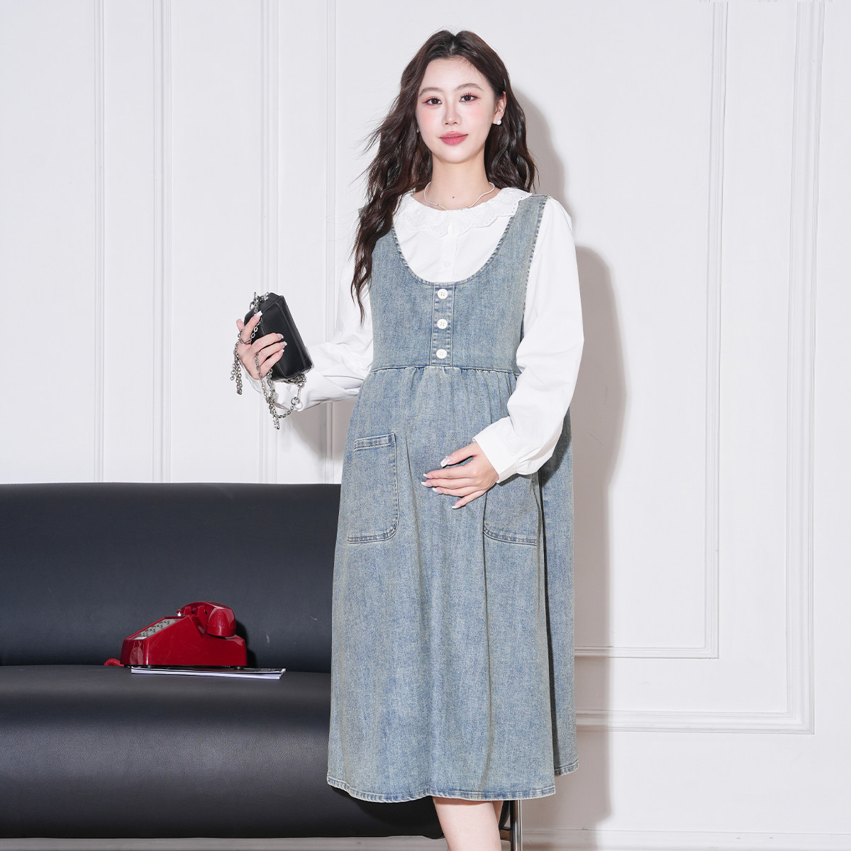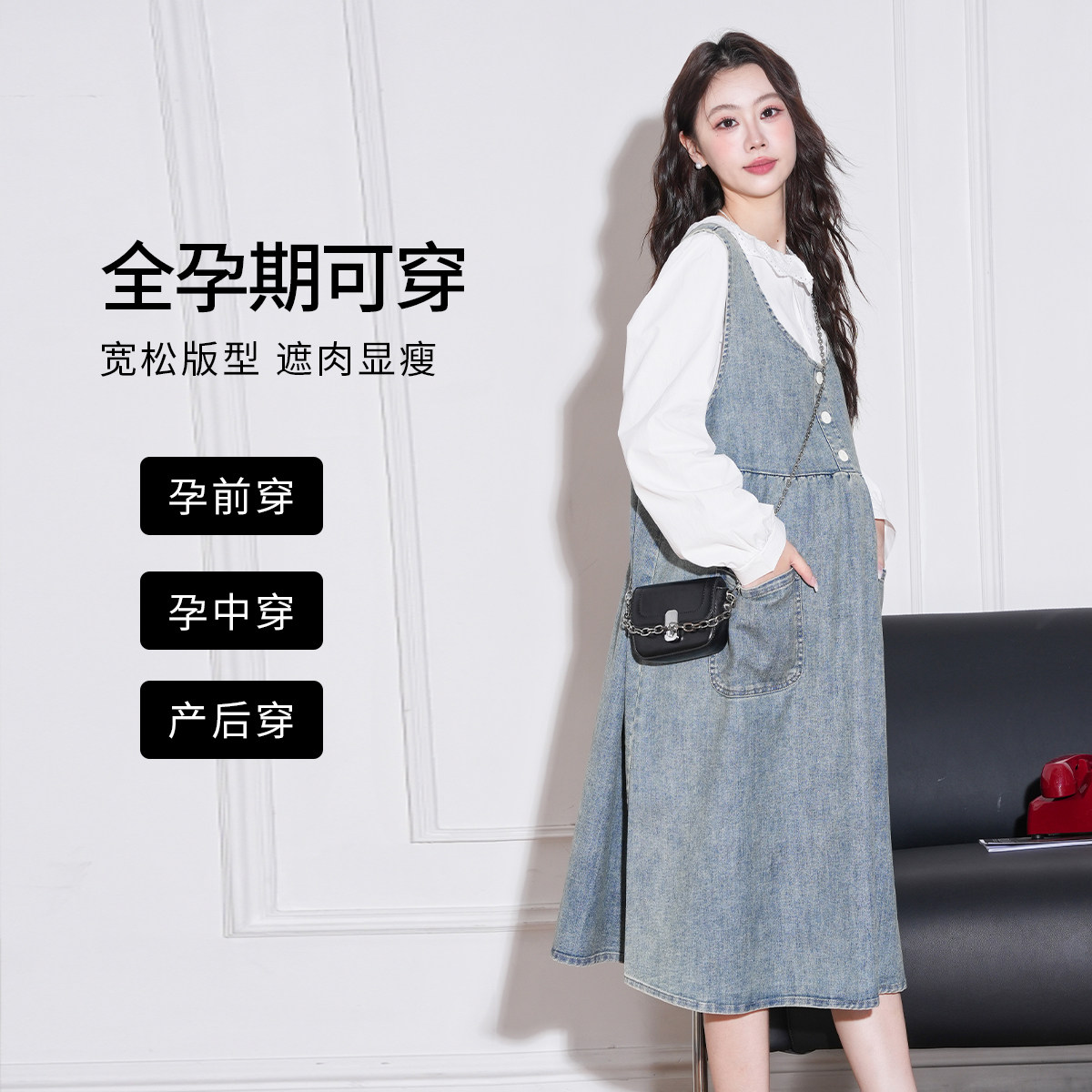 婧麒孕妇装背心裙套装2026新款孕期法式牛仔衬衣背心连衣裙两件套