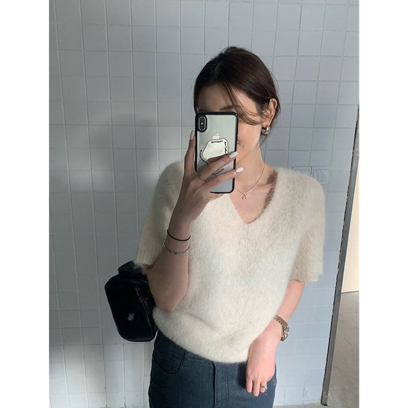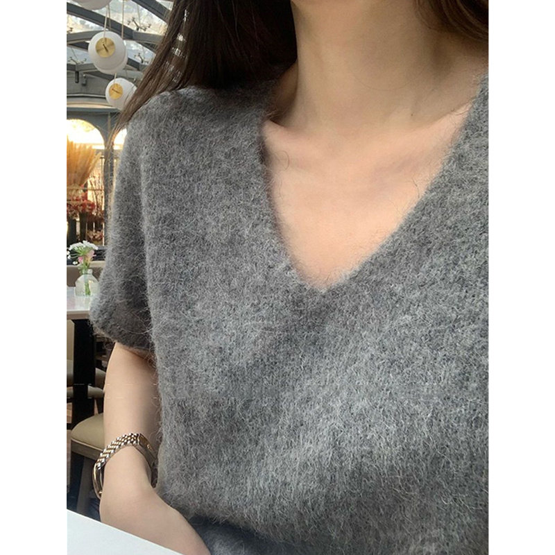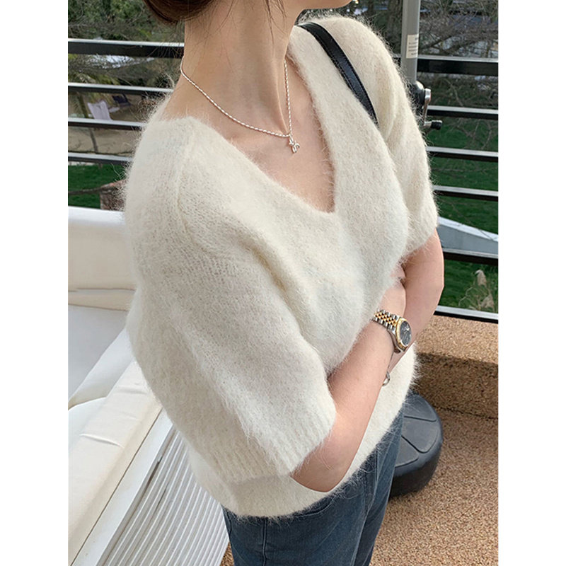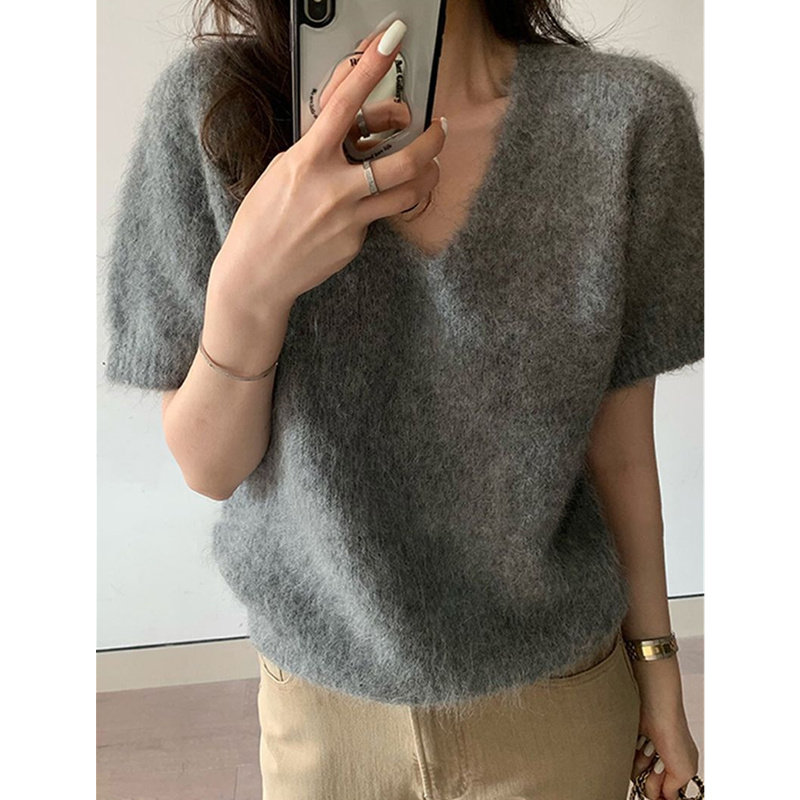 甜欲风春秋款短袖毛衣女复古宽松百搭V领针织衫上衣
