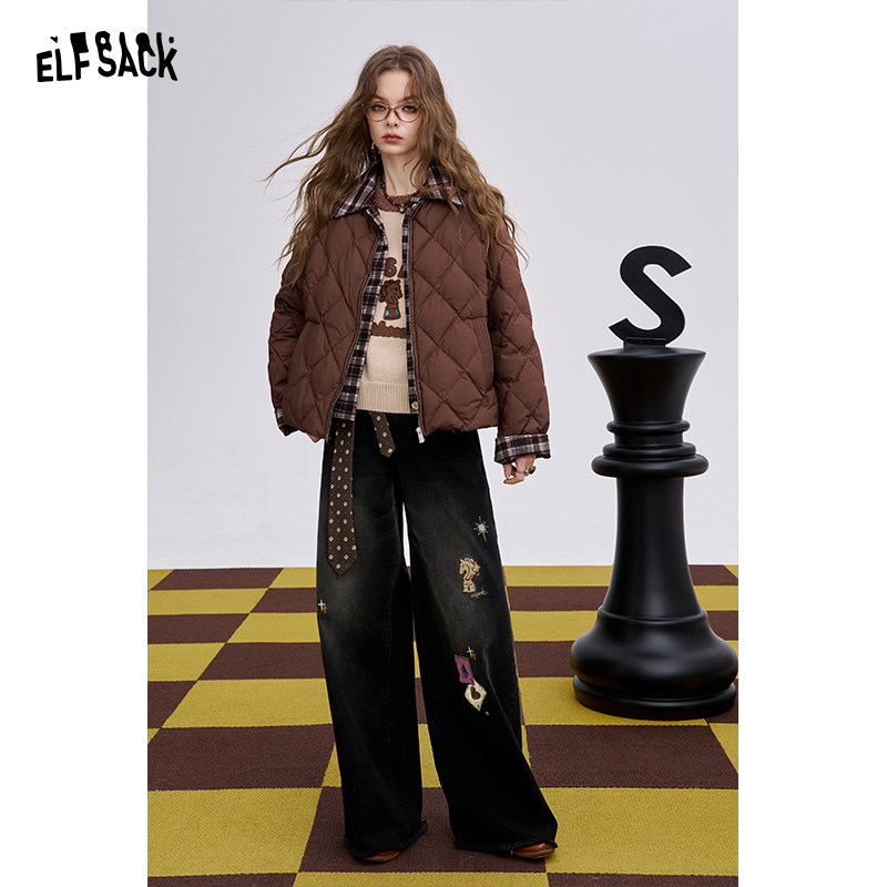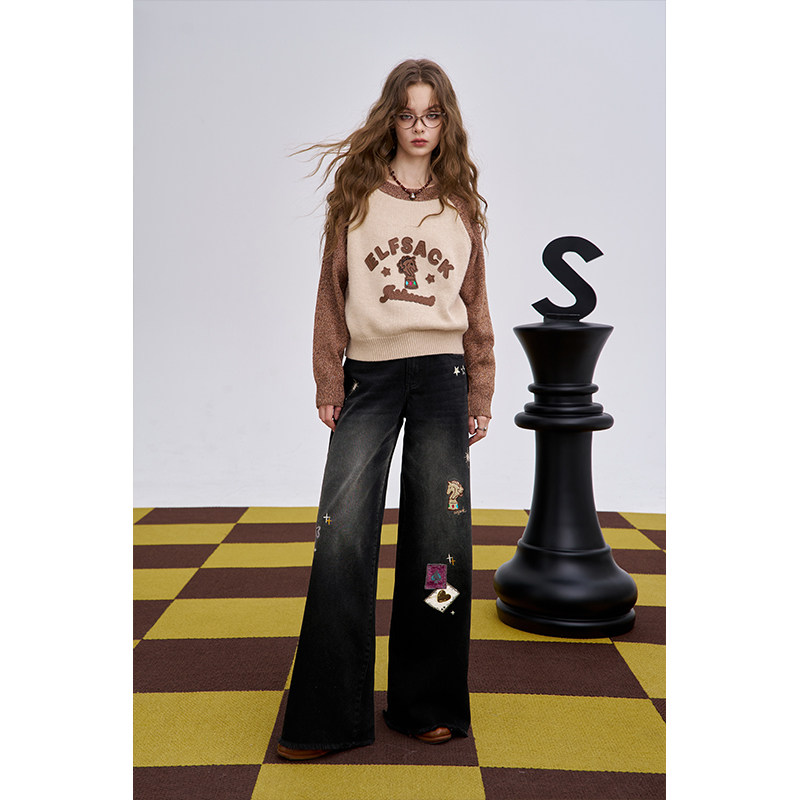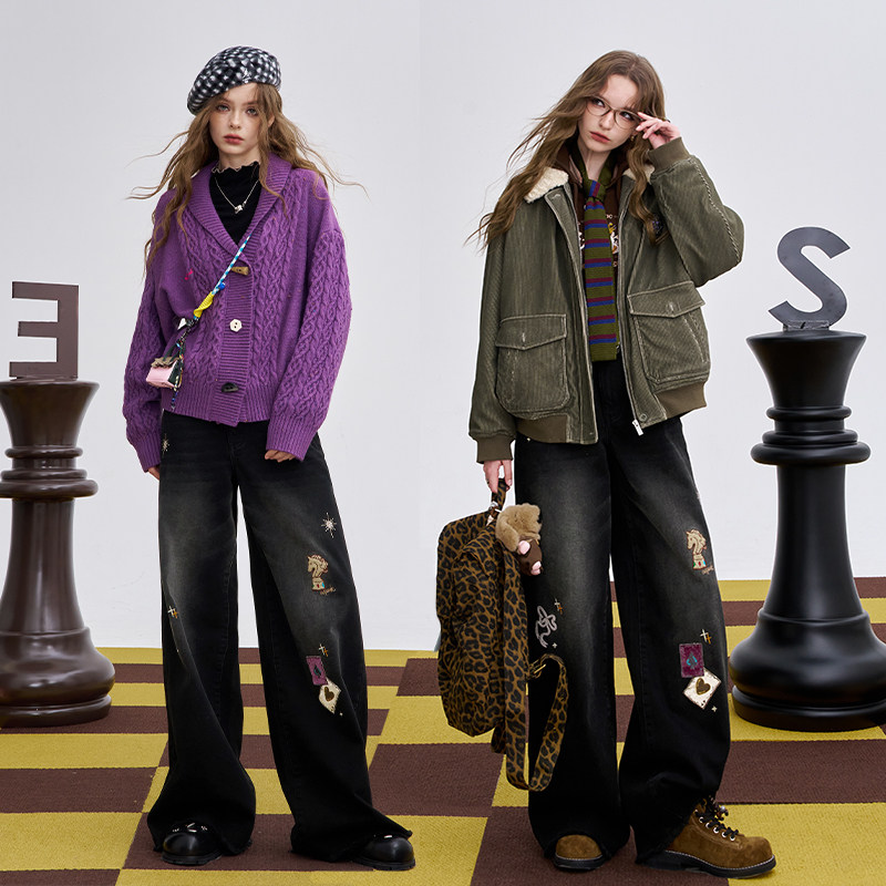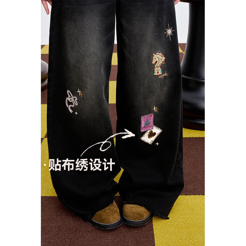 妖精的口袋复古贴布刺绣加绒牛仔裤女2025年秋冬新款休闲阔腿裤子
