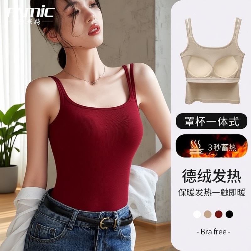 德绒保暖吊带背心女2025新款秋冬内搭加绒发热无痕带胸垫一体内衣