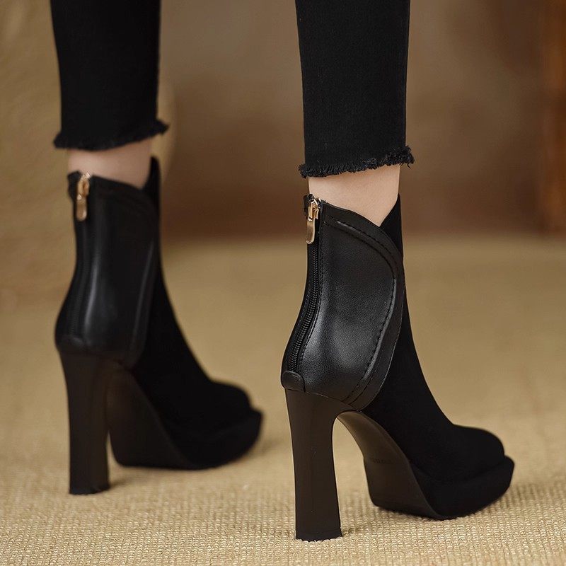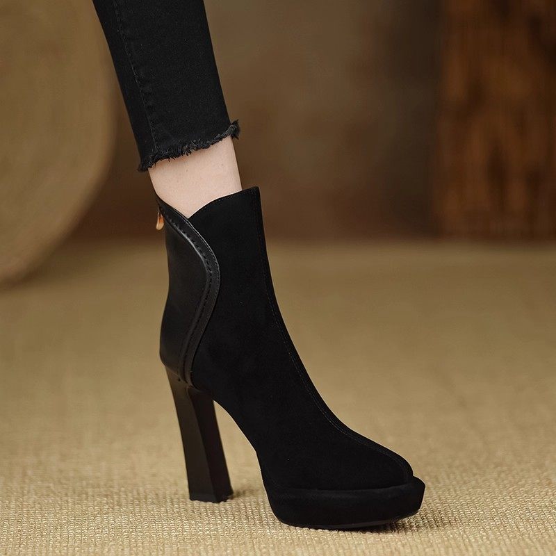 2025冬季小个子防水台高跟鞋粗跟圆头厚底短靴女马丁靴超高跟磨砂