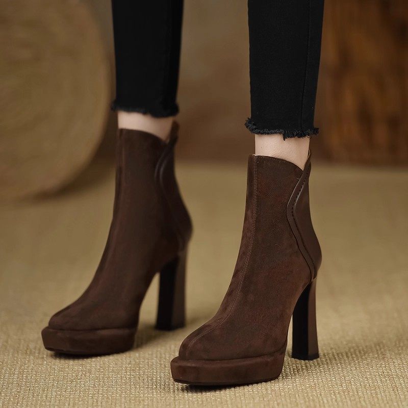 棕色靴子!小个子内增高7CM法式方头靴2025冬新款绒面粗跟短靴女