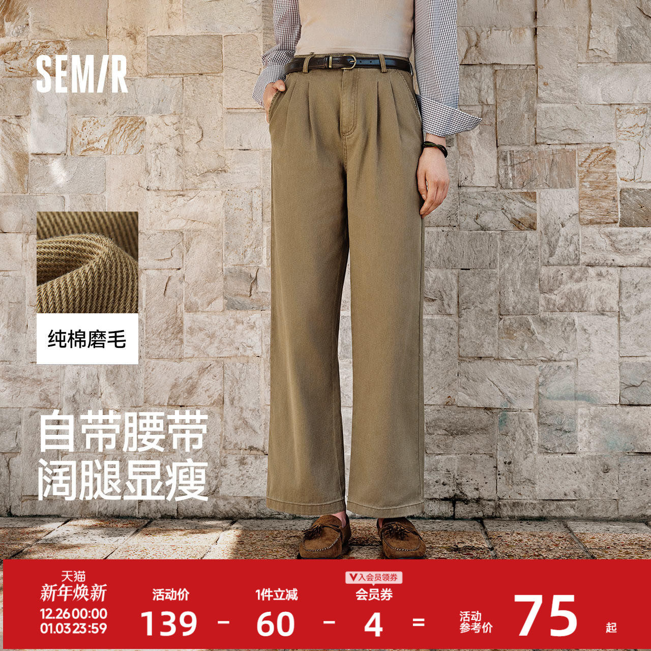 森马休闲裤女腰带磨毛纯棉阔腿裤时尚潮酷秋复古做旧打褶长裤街头