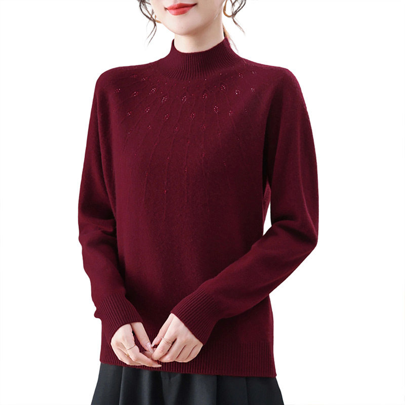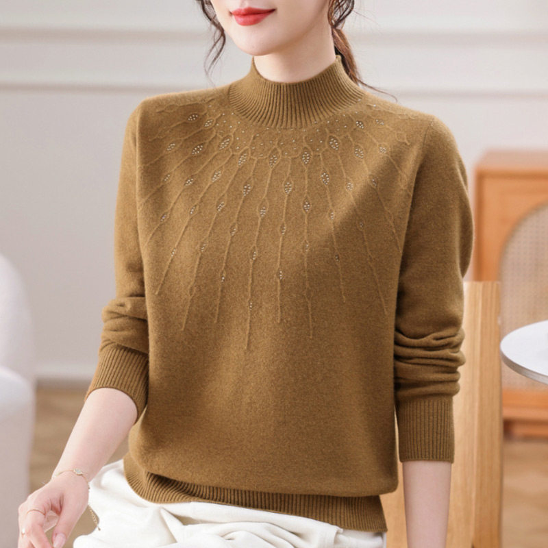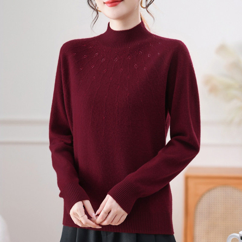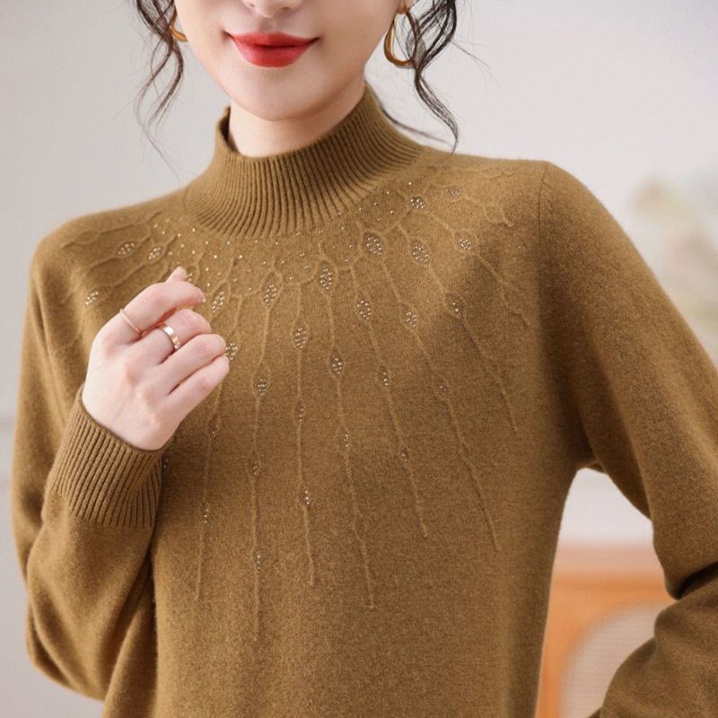 恒源祥纯色打底衫100%绵羊毛衫女装半高领妈妈装烫钻毛衣针织衫