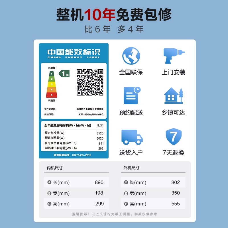 海尔净畅1.5匹空调家用挂式变频一级能效挂机冷暖两用卧室小型GCA