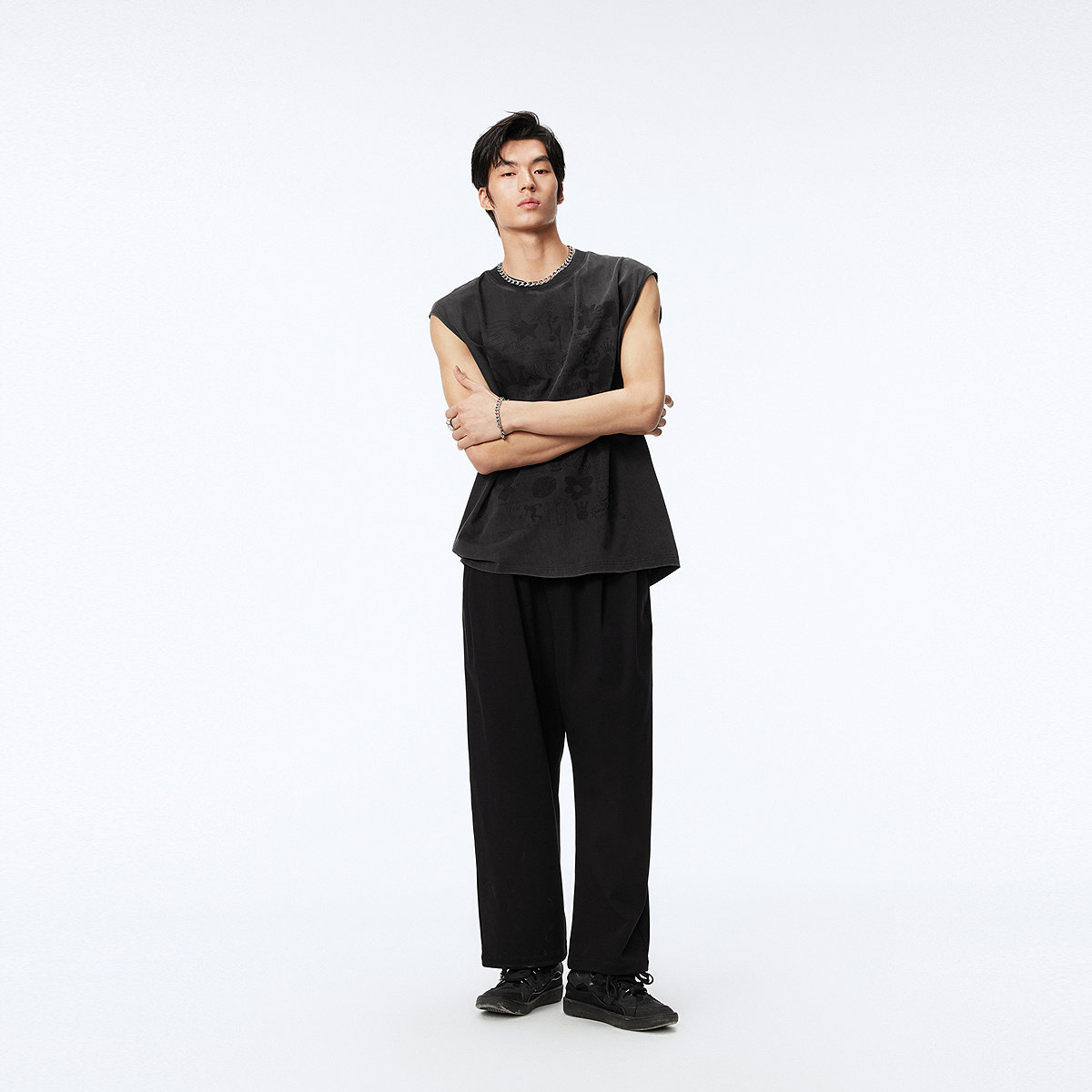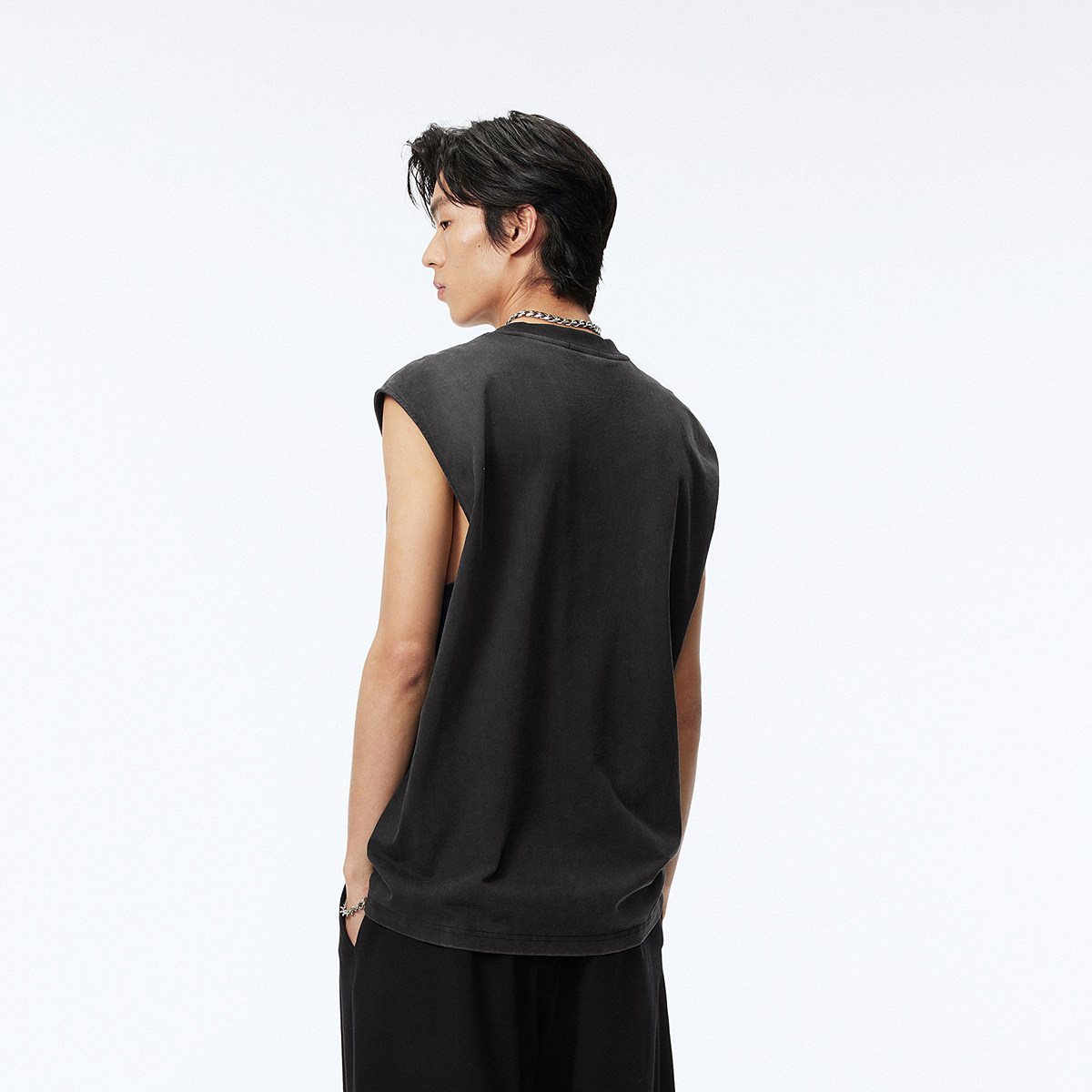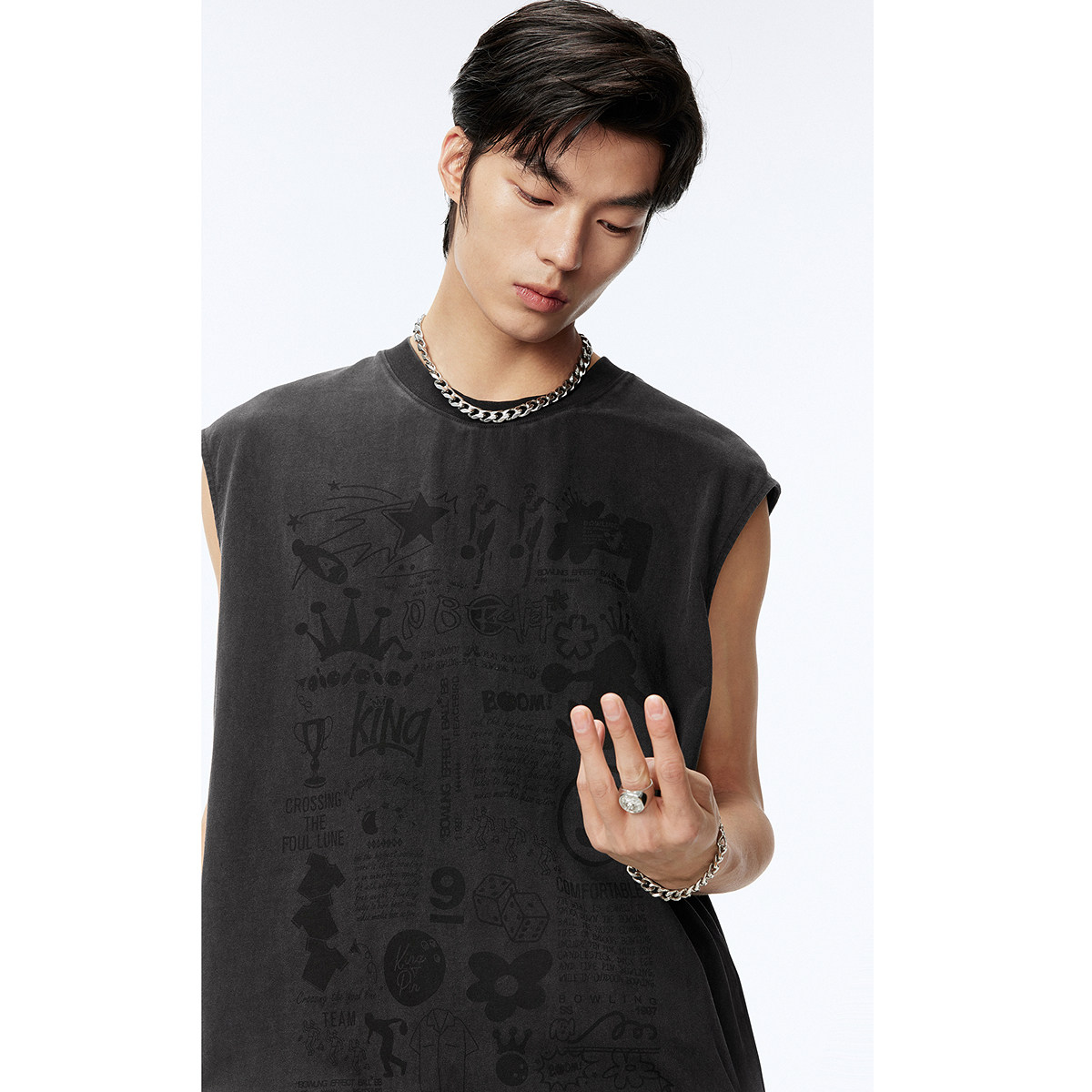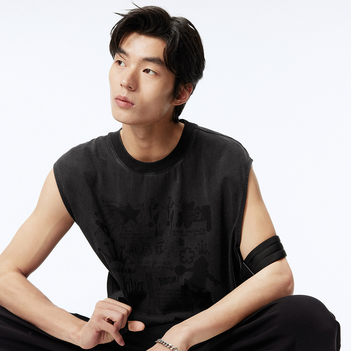 太平鸟男装无袖t恤夏潮流美式复古水洗黑色背心青年宽松圆领体恤