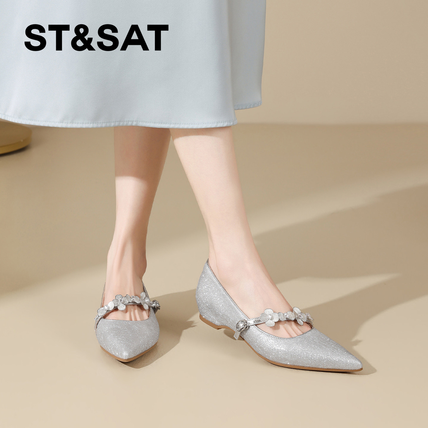 星期六法式水钻花朵浅口单鞋女2026年春季新款尖头内增高坡跟婚鞋