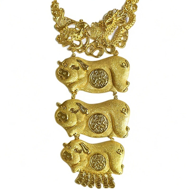 新娘结婚高级感仿真金金猪吊牌项链女款华丽三金首饰龙凤项坠饰品