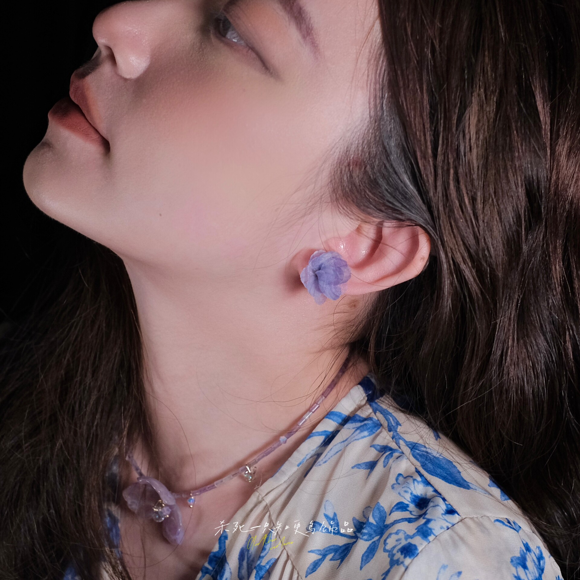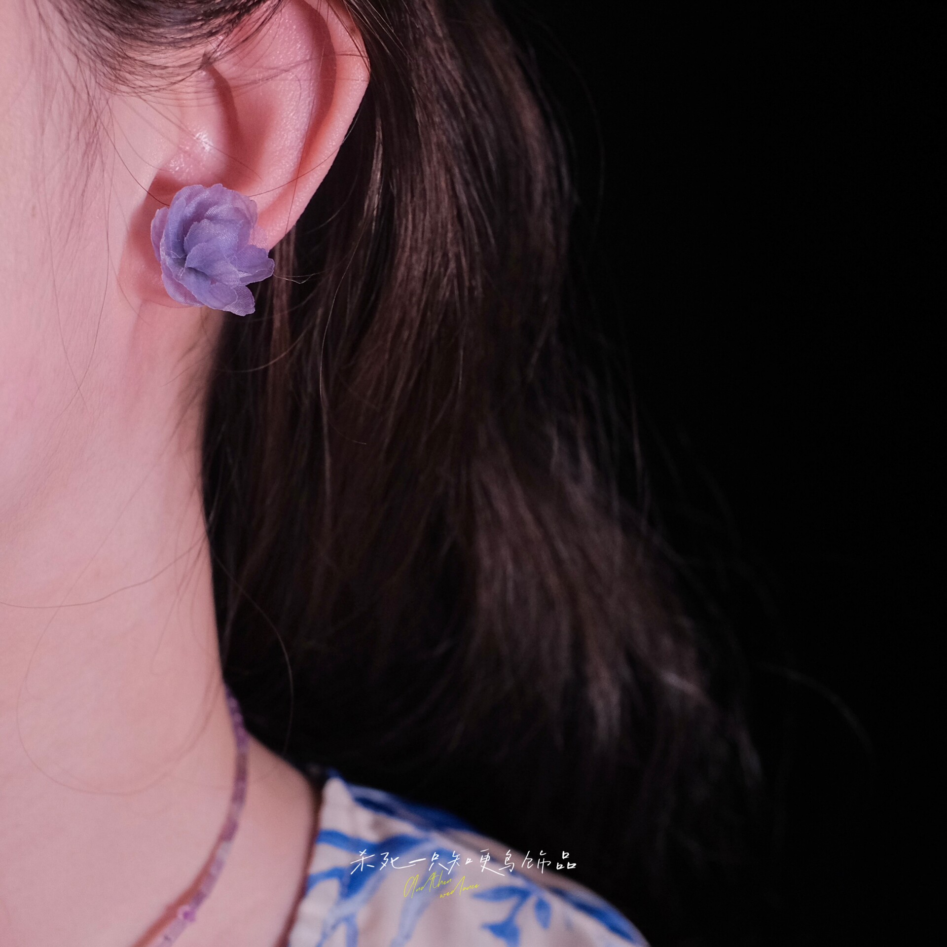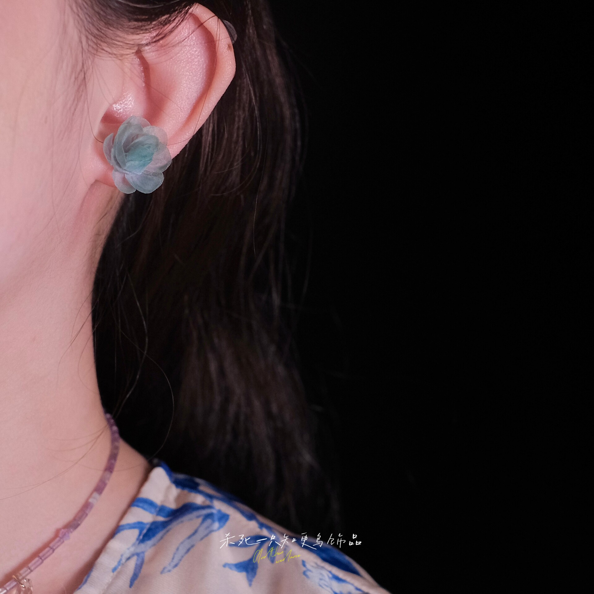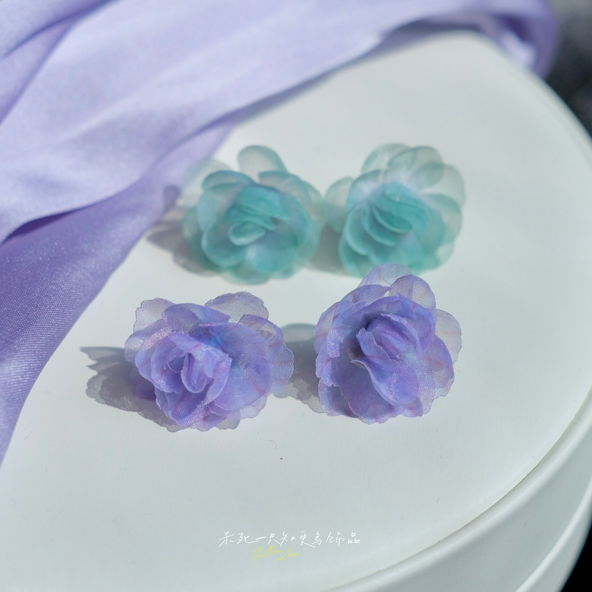 《柔雾山茶》原创春夏清冷仙气蓝紫色晕染欧根纱花朵耳钉耳环耳夹