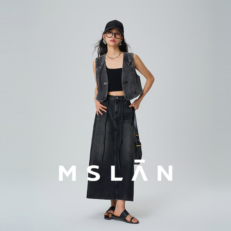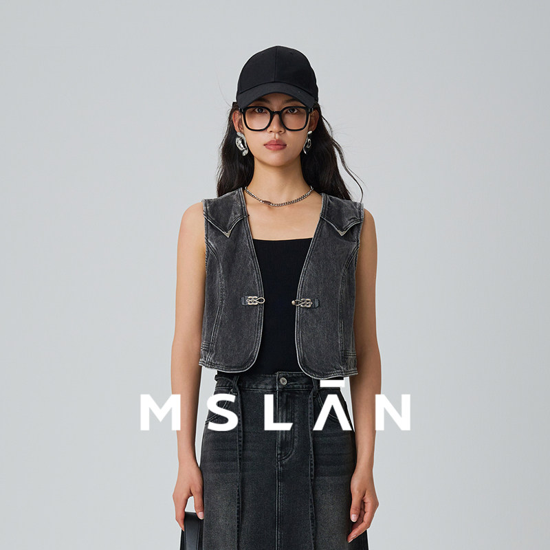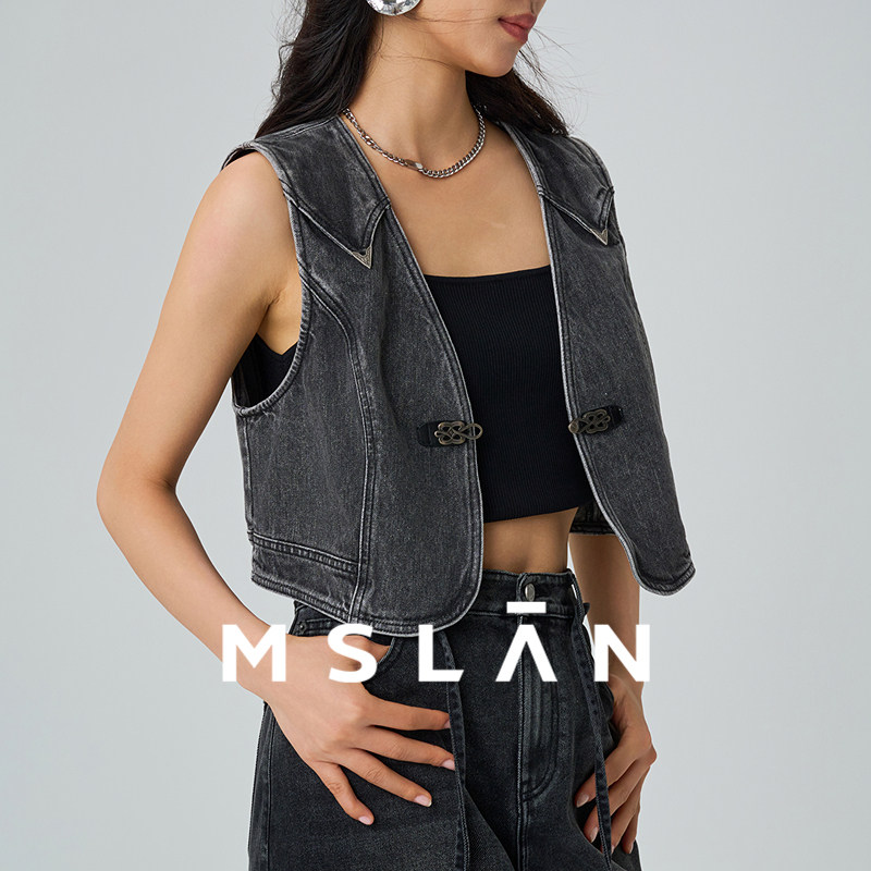 新中式/MSLAN26春时尚通勤纯棉休闲水洗灰色做旧牛仔马甲MFCM2103