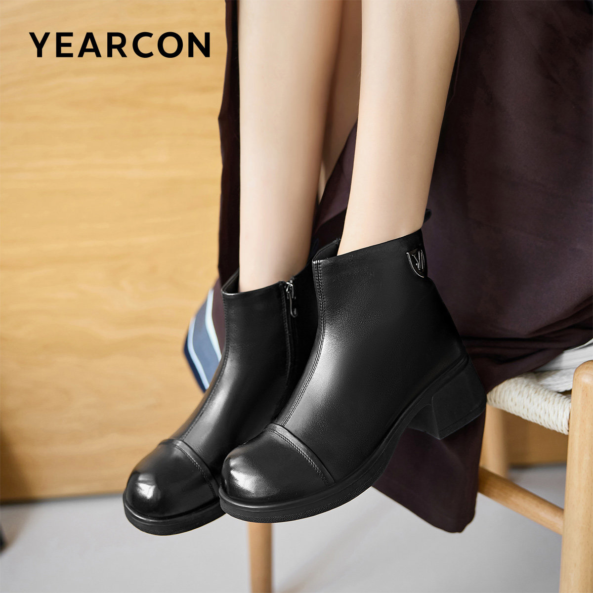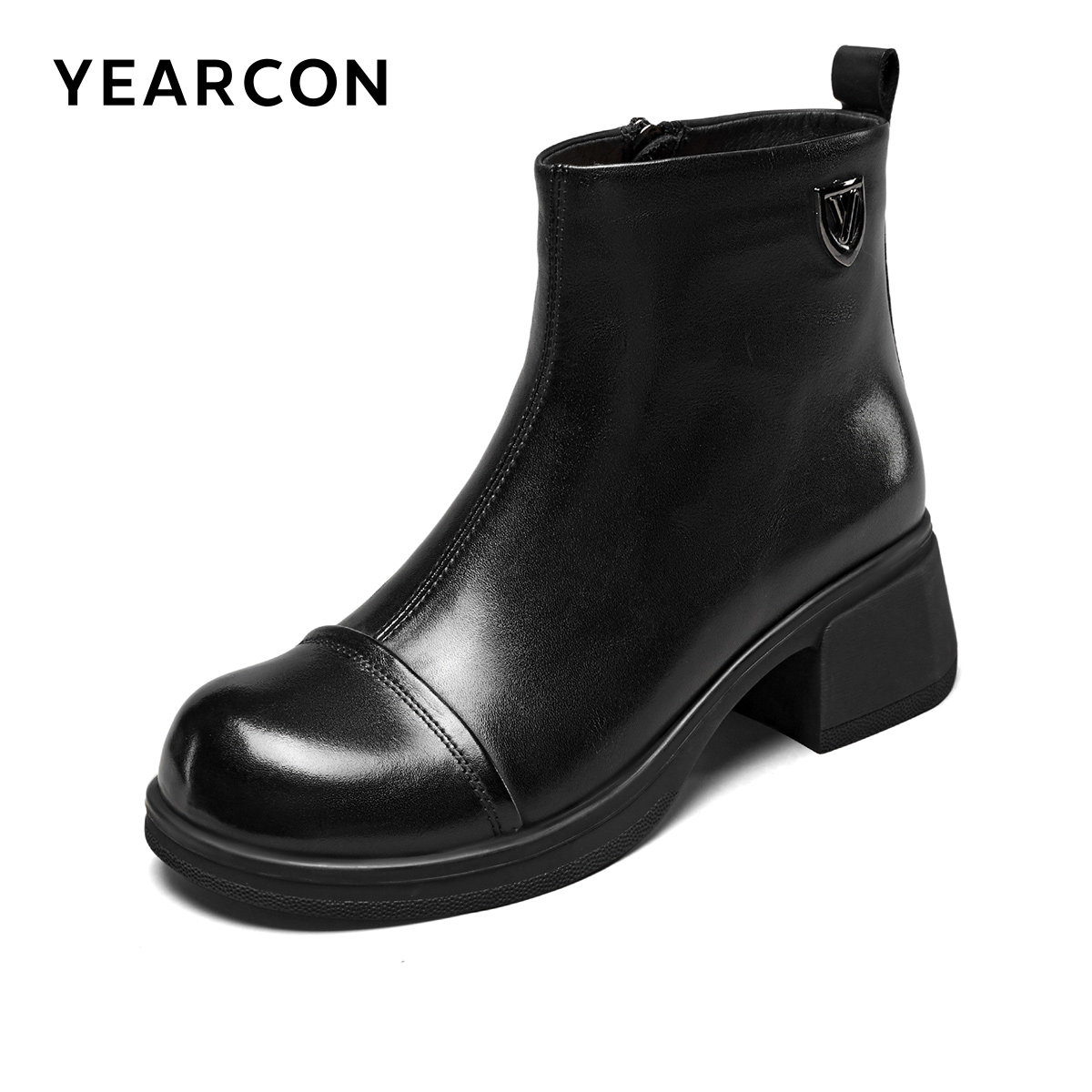 意尔康女鞋2025冬季真皮法式短靴粗跟气质显瘦单靴及踝靴女士皮鞋