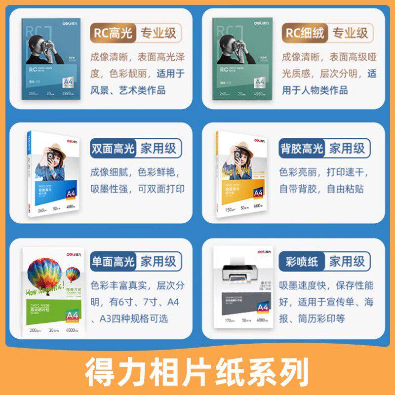 得力相片纸6寸7寸a4高光涂层照片打印专用A4喷墨打印高清双面高光纸照片纸高品质证件照喷墨高清双面相片纸
