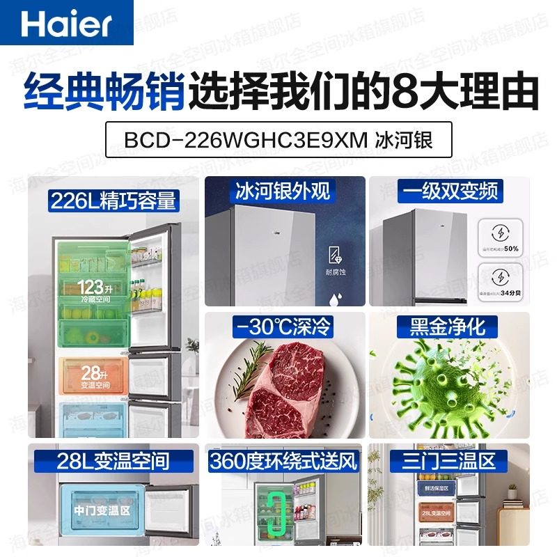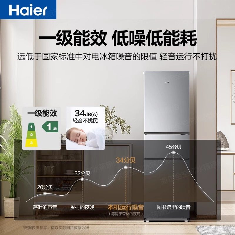 【国补告急】海尔冰箱226升三开门一级变频家用小型宿舍官方正品