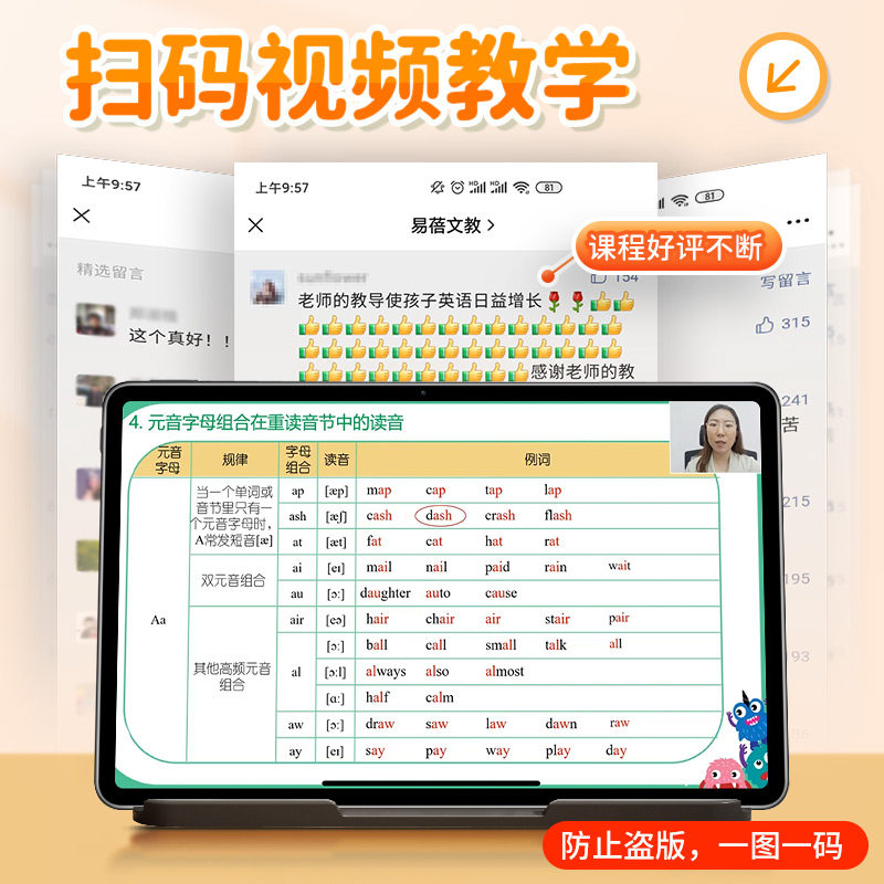 【易蓓】小学英语自然拼读挂图入门48个国际音标发音规则表启蒙英语视频有声讲解学习神器字母表学习墙贴挂图自然拼读发音学习教材
