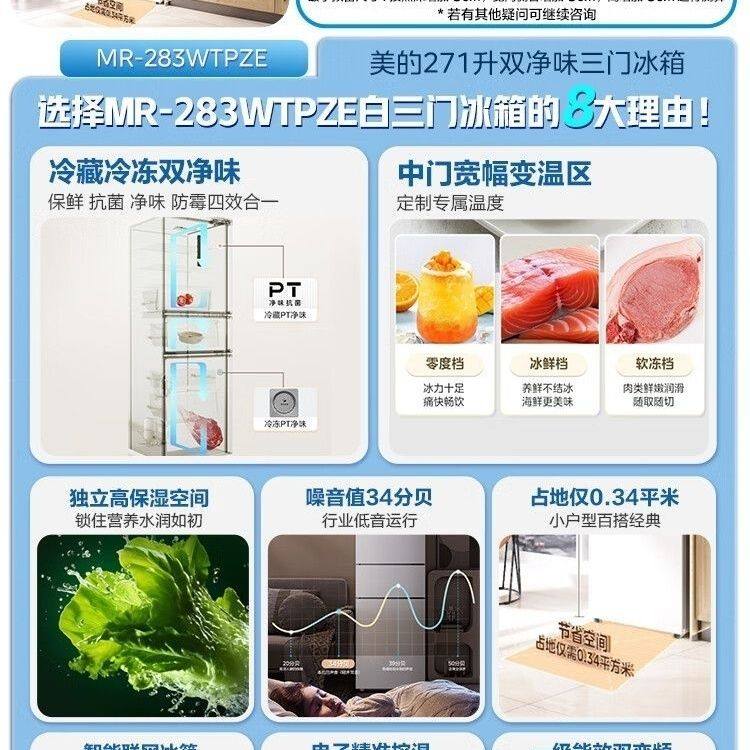 Midea/美的 MR-283WTPZE极地白三开门多门风冷无霜小户型家用冰箱