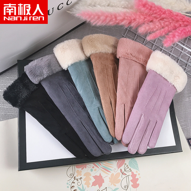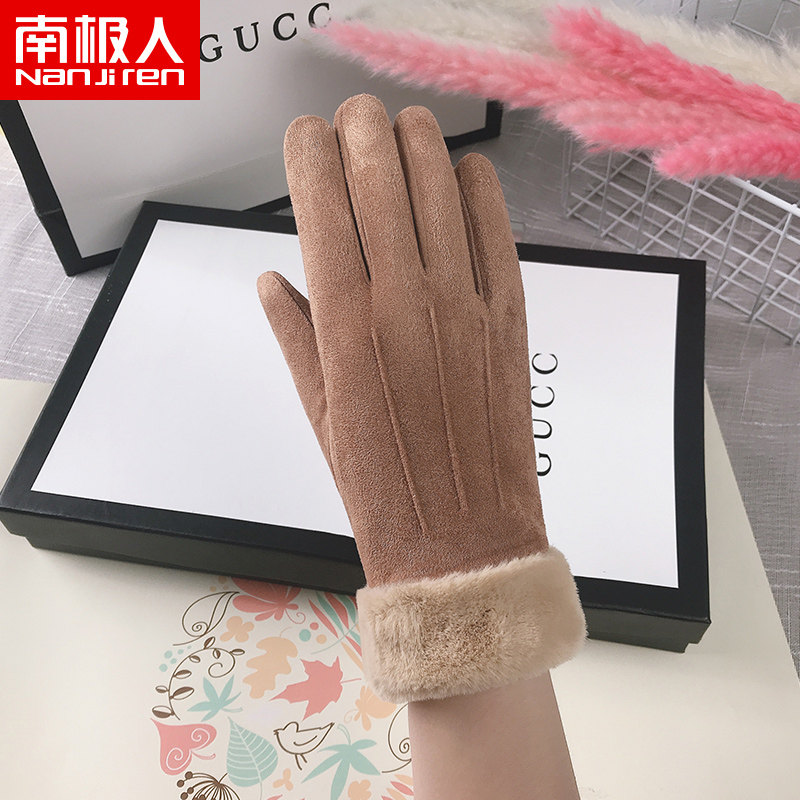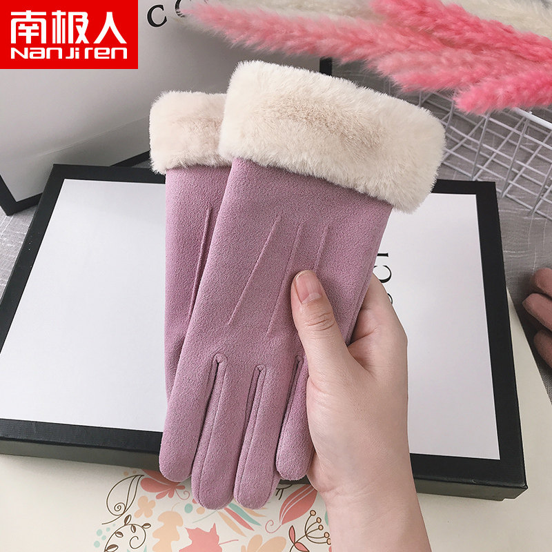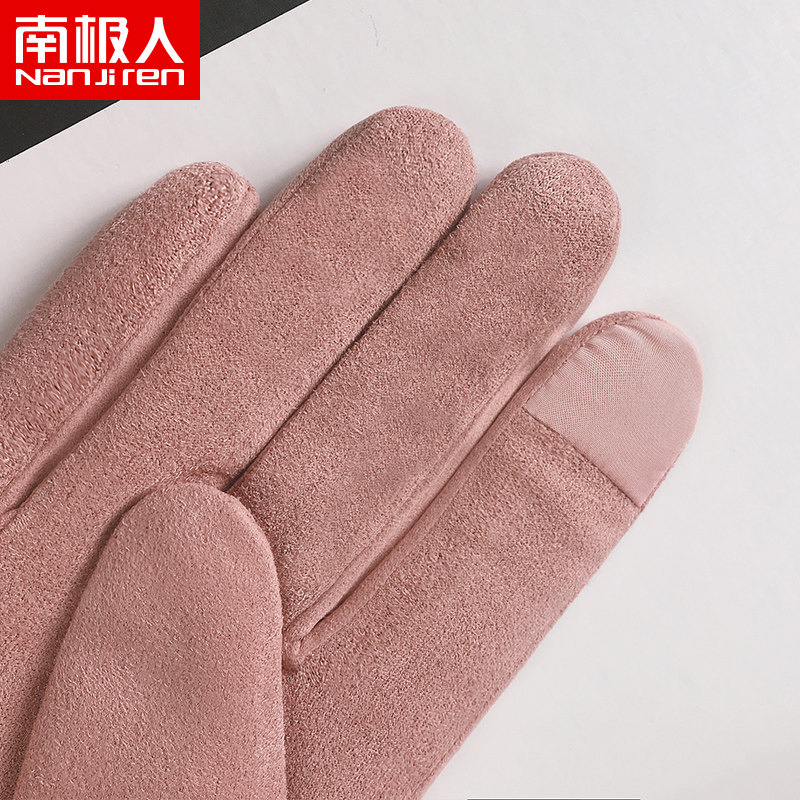 南极人冬天骑行手套女加绒加厚保暖触屏开车防寒纯色麂皮绒学生H
