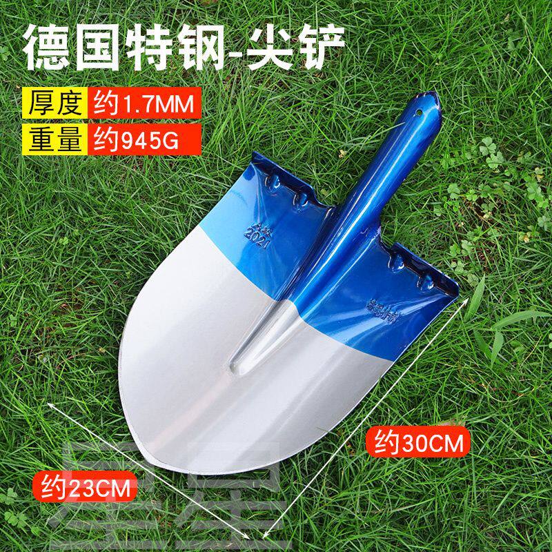 铲子户外尖方煤农用锹蓝色钢锹钢铲铁锨淬火锰钢大铲园林木柄植树