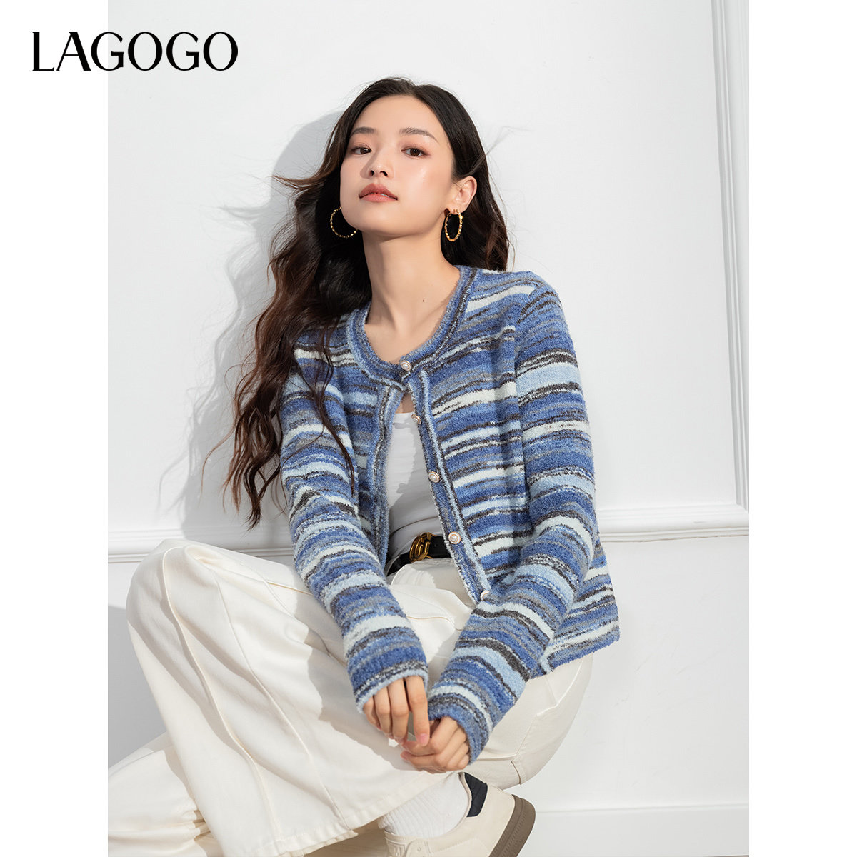 LAGOGO含羊毛条纹撞色毛针织衫女拉谷谷春秋新款小香风简约上衣