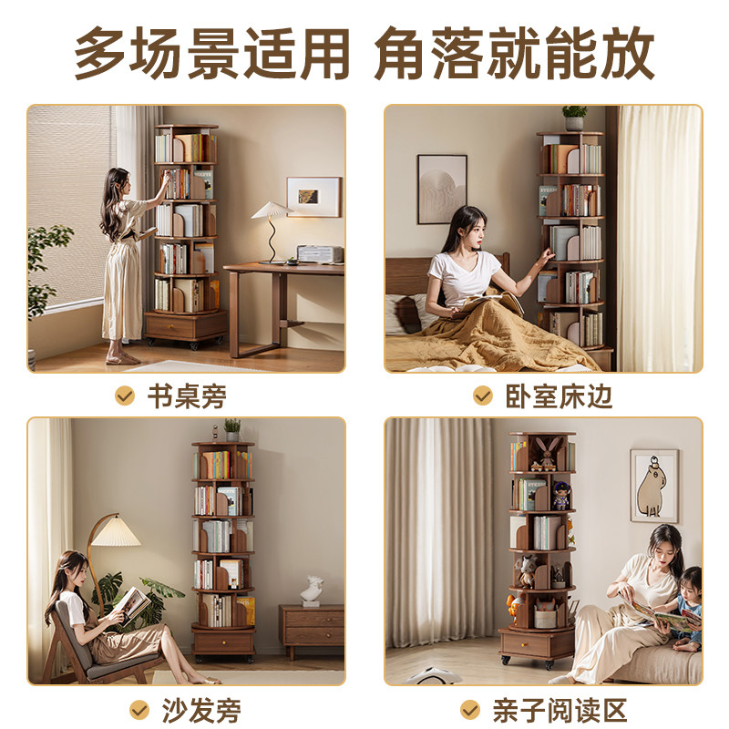 实木旋转书架360度书柜置物架落地一体靠墙可移动转角儿童小窄柜