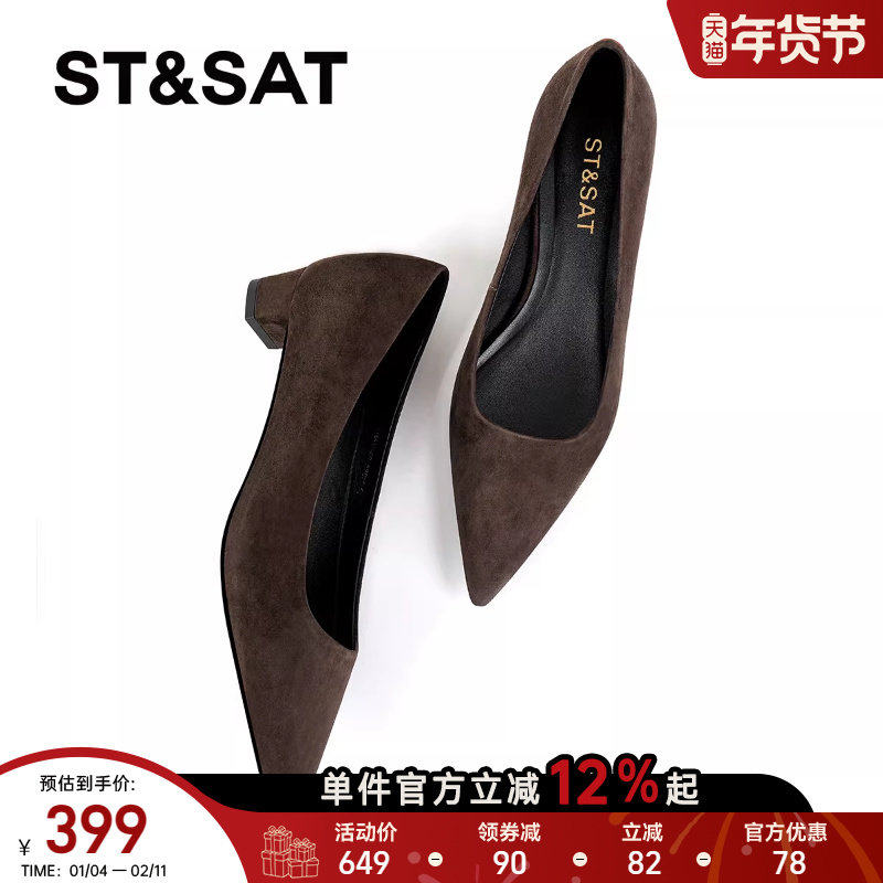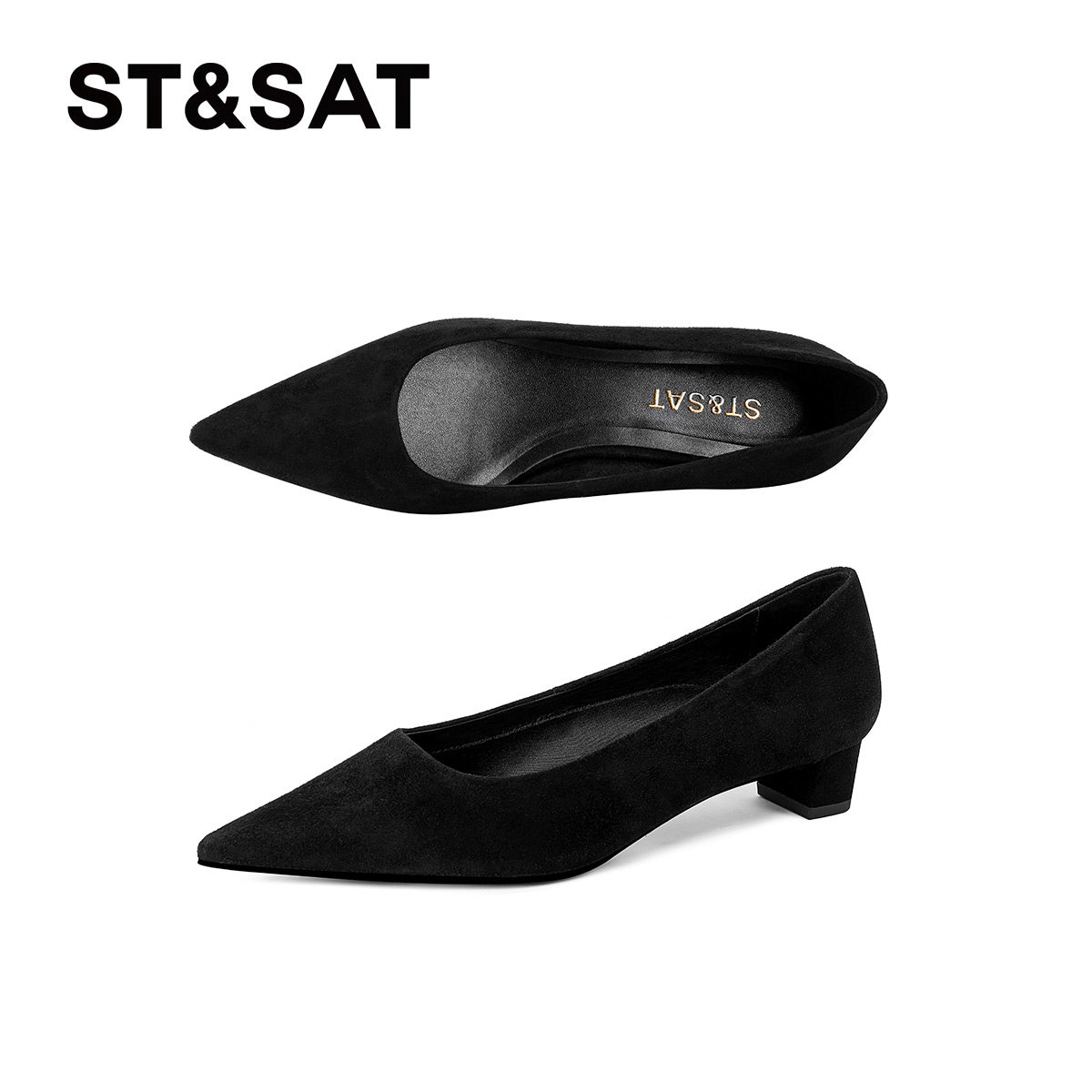 星期六黑色单鞋女2025真皮尖头浅口粗跟女鞋上班通勤不累脚工作鞋