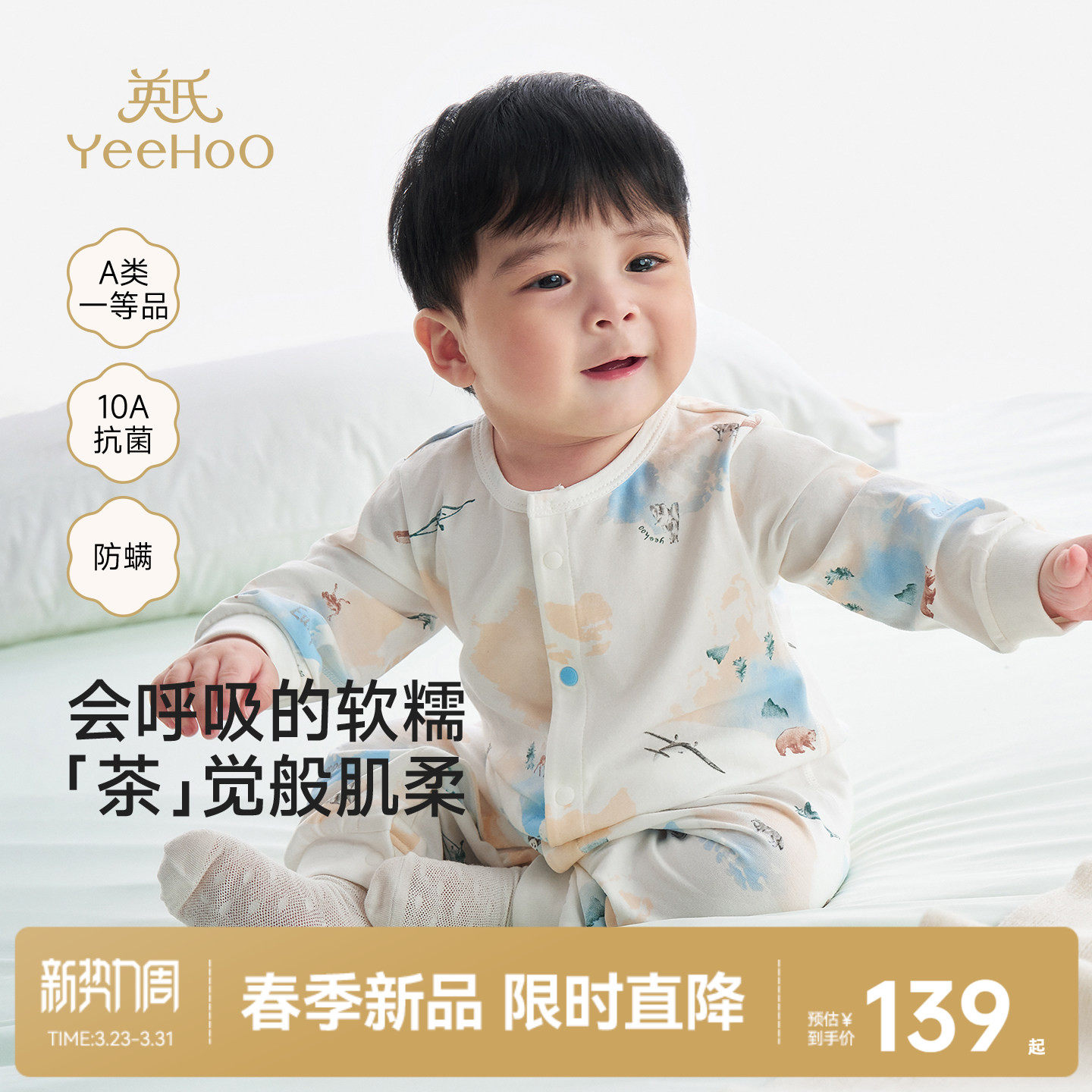 [小茶柔]英氏婴儿春季连体衣10A抗菌宝宝莫代尔哈衣新生衣服爬服