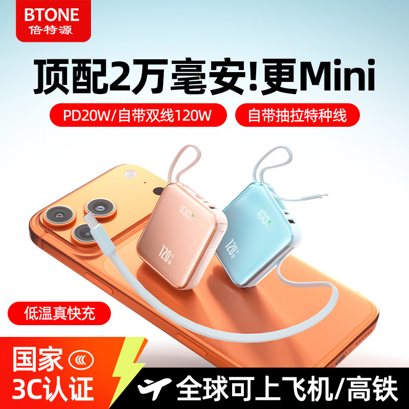 【倍特源2025新款国标3C认证】迷你自带线快充充电宝20000毫安移动电源小巧便携自带双线可插线快充送朋友