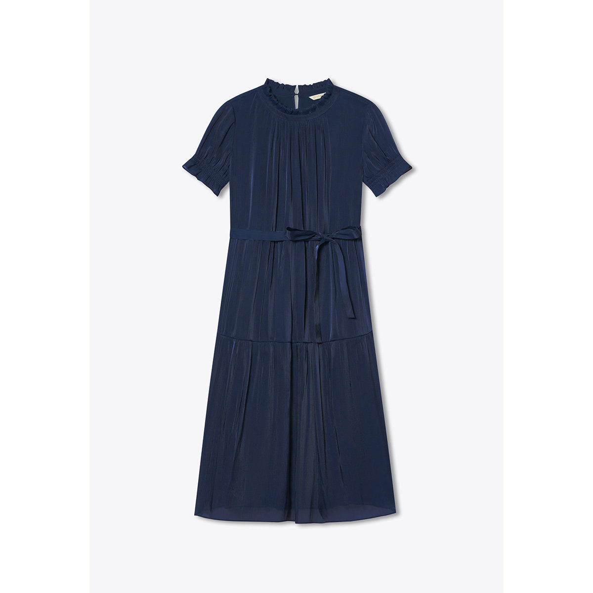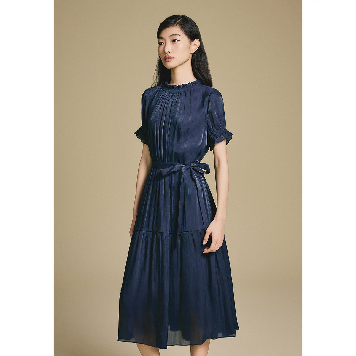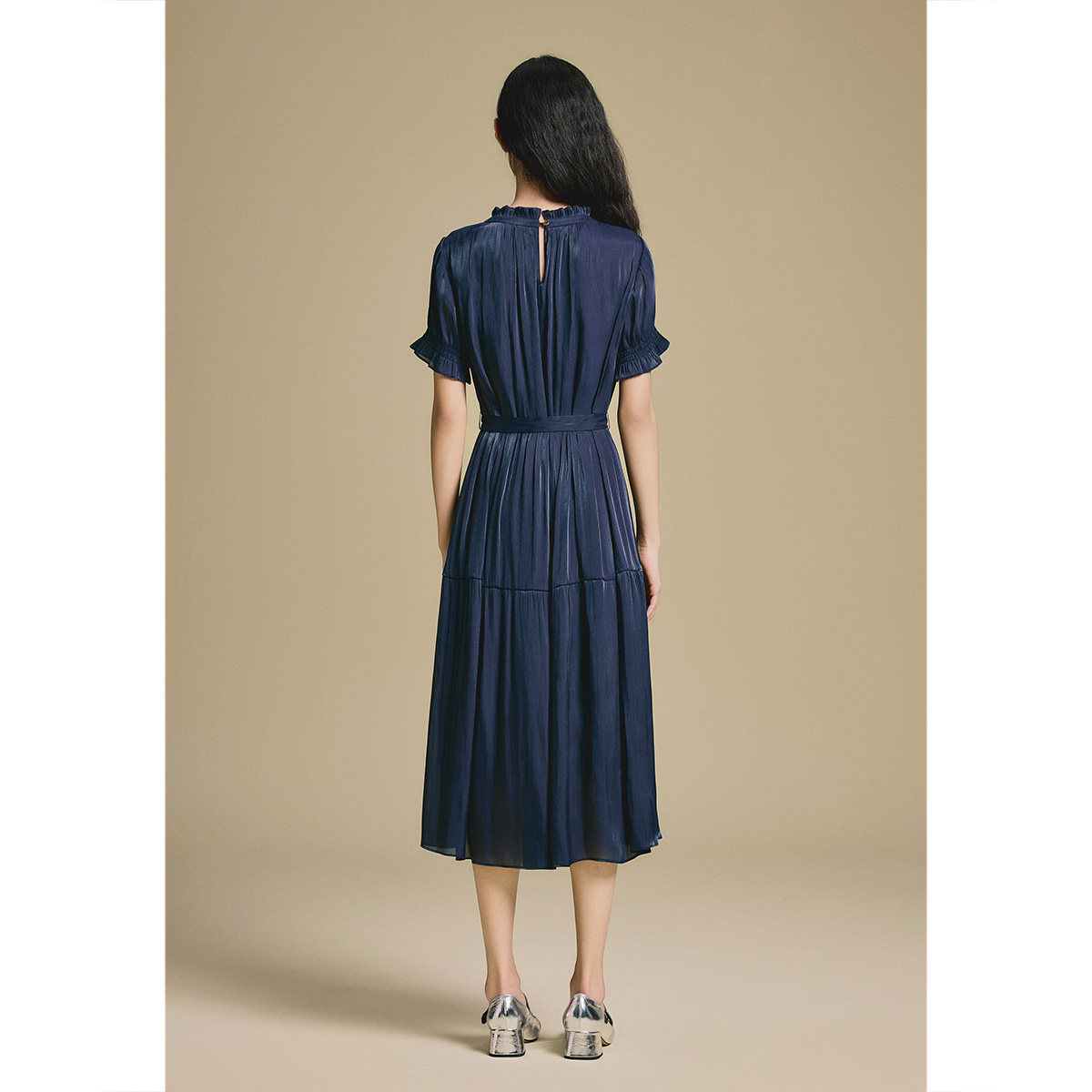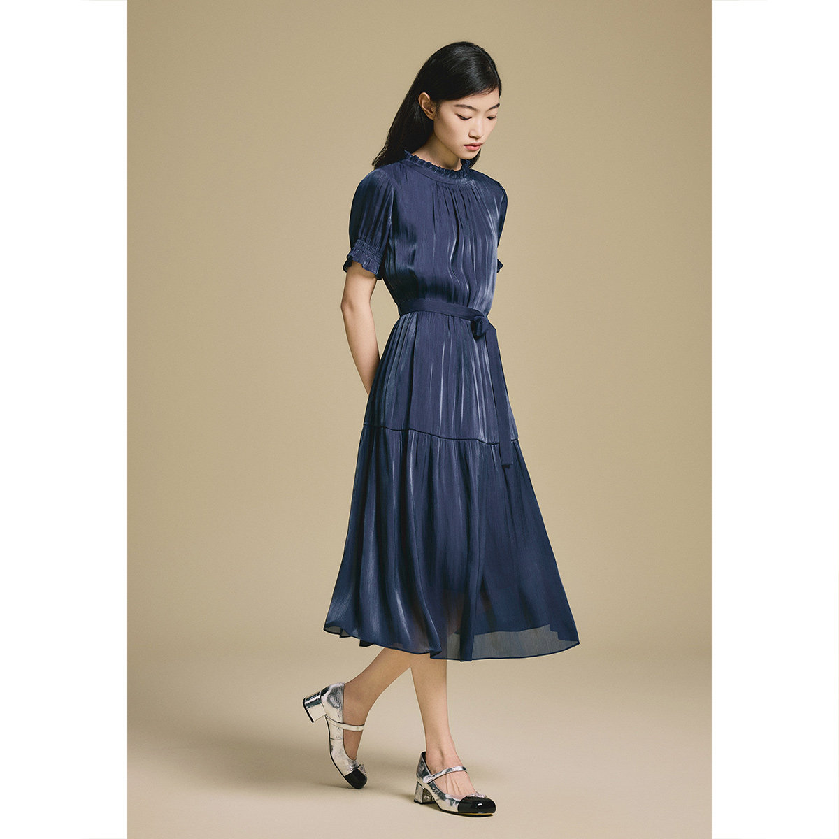 诗篇专选木耳边领系带海岛丝缎面柔软飘逸长款连衣裙2025夏款