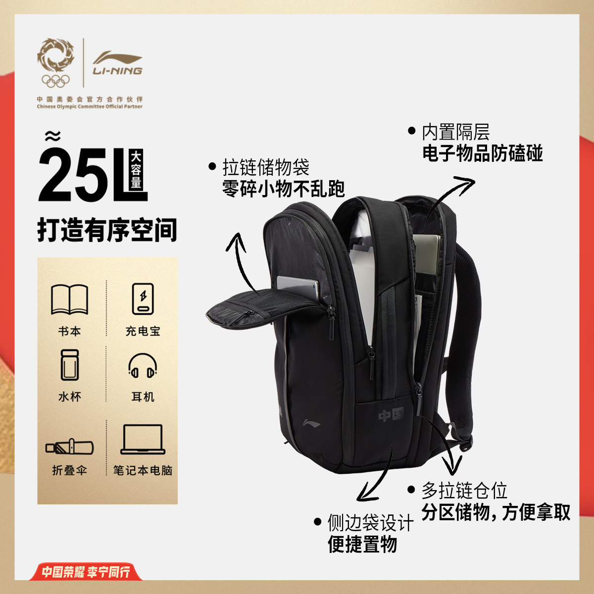 李宁荣耀系列双肩包男包女包2026新款官方正品背包学生书包运动包