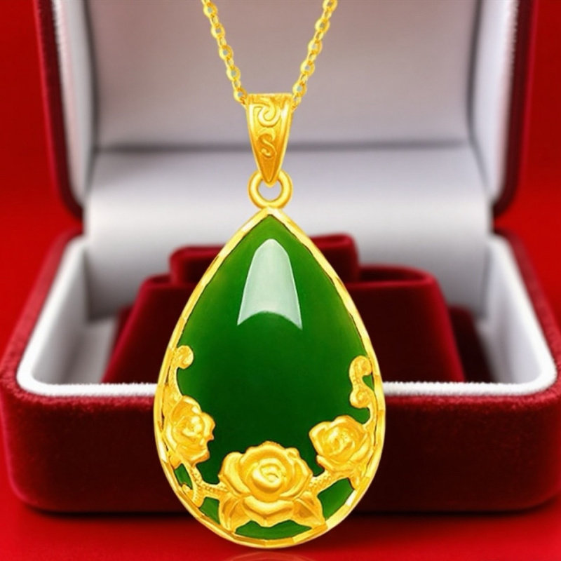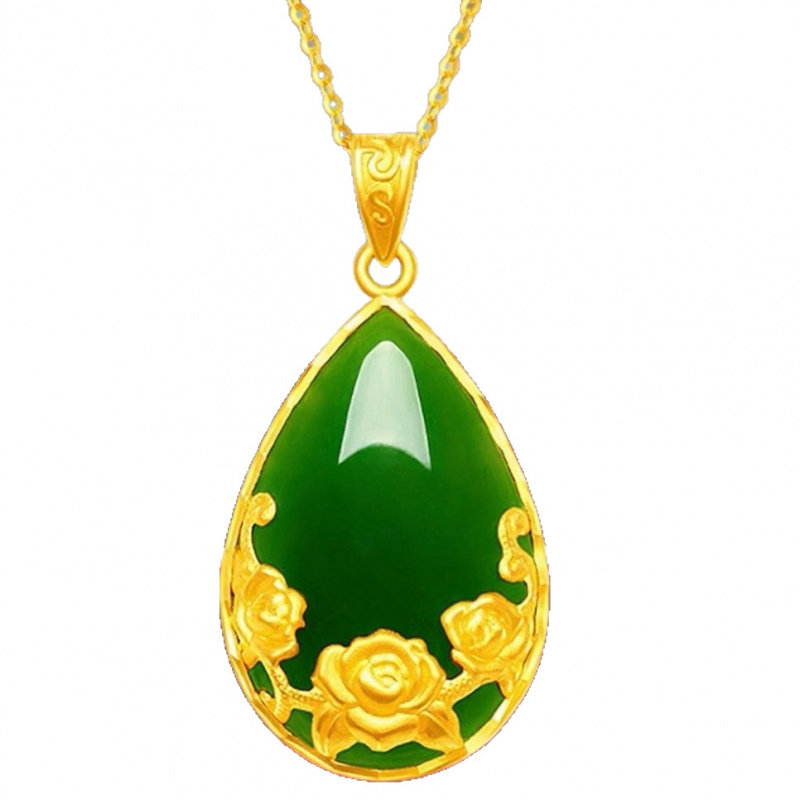 镀图腾镶嵌和田玉碧水玫瑰花吊坠典雅碧玉水滴项链挂坠