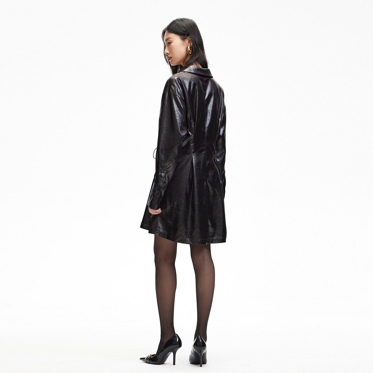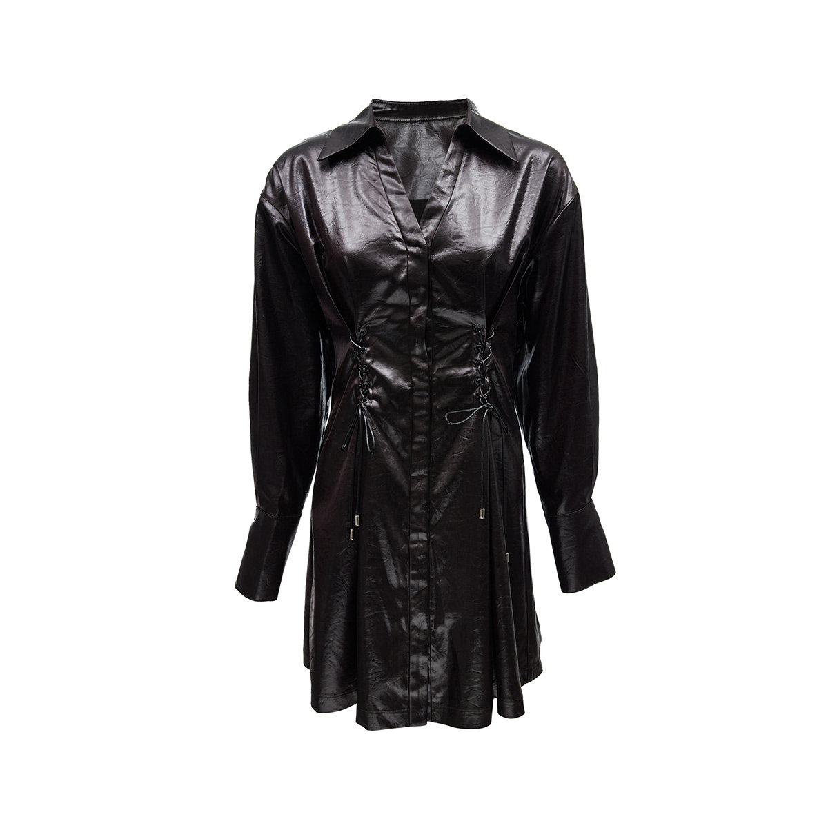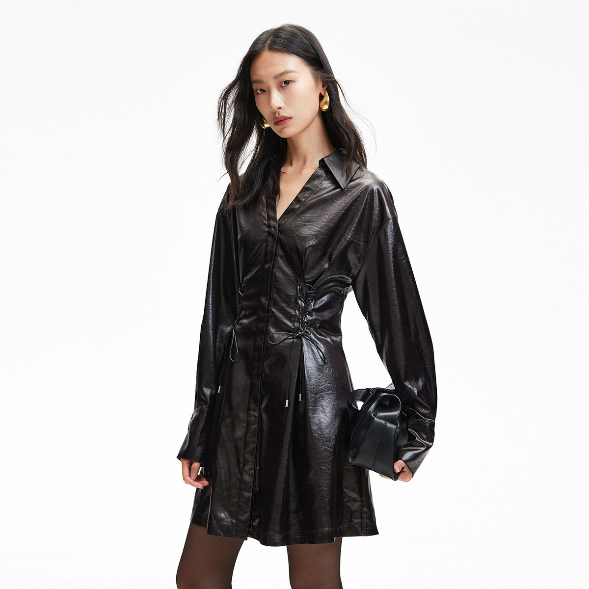 Vero Moda连衣裙女2025春季新款光泽感面料绑带翻领PU连衣裙