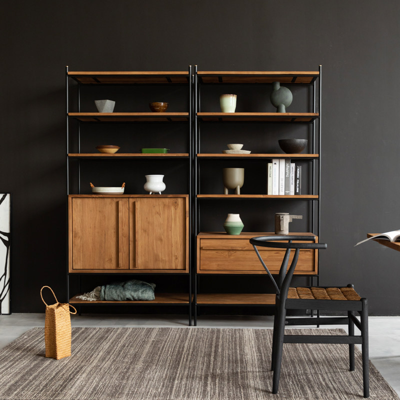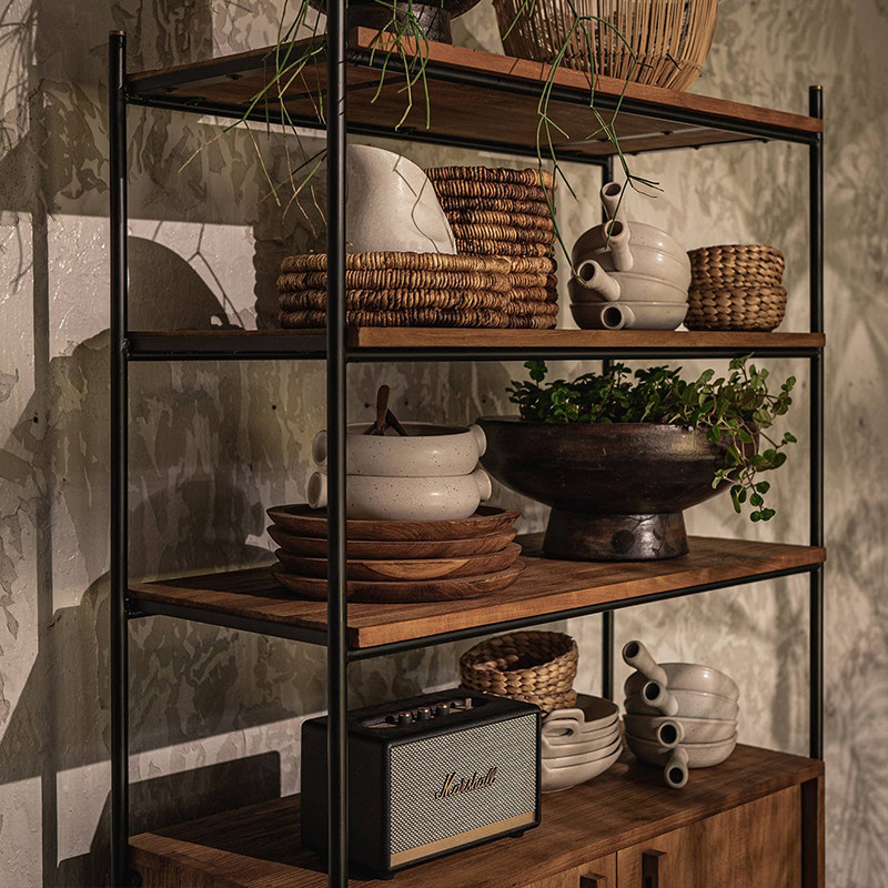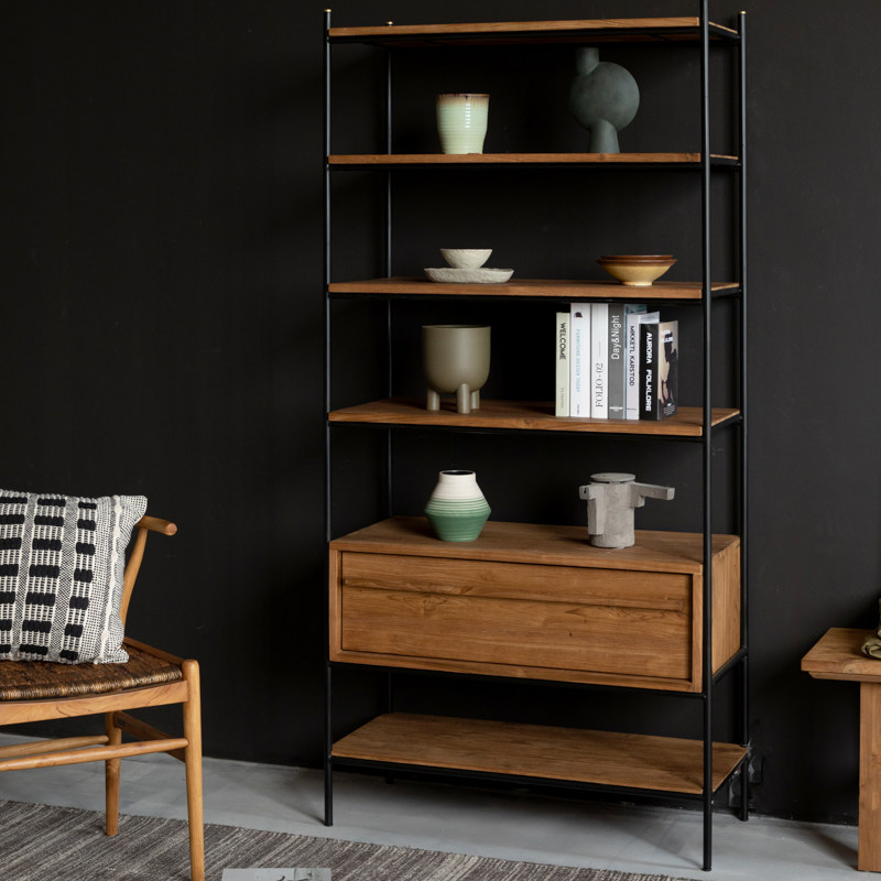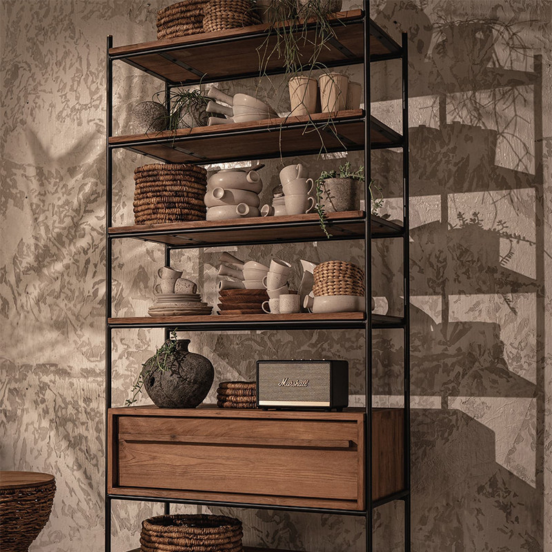 MountainLiving进口老柚木家具实木书架多层板置物架铁艺落地靠墙
