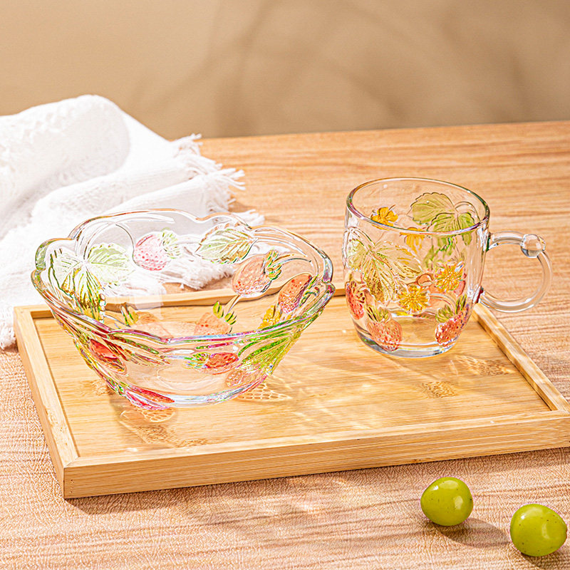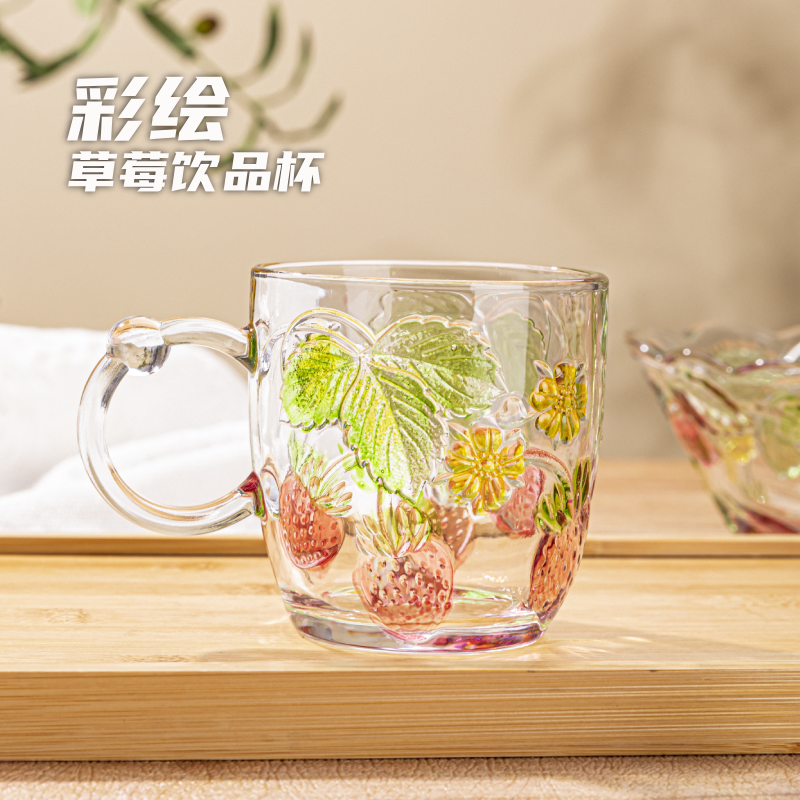 创意草莓彩绘玻璃杯家用浮雕泡茶水杯高颜值透明咖啡杯女牛奶杯子