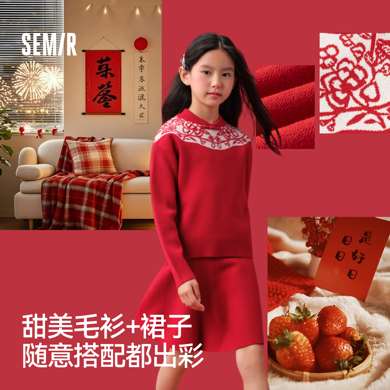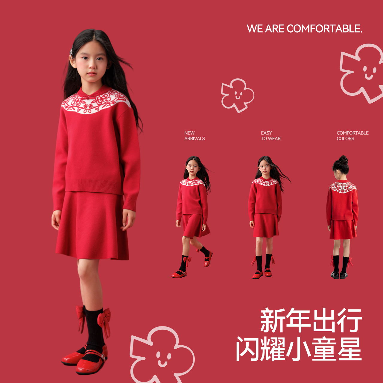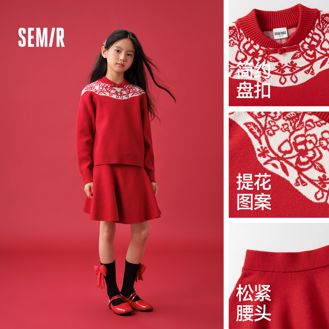森马儿童套装2025春新款新中式毛衣短裙两件套女童拜年服红色提花