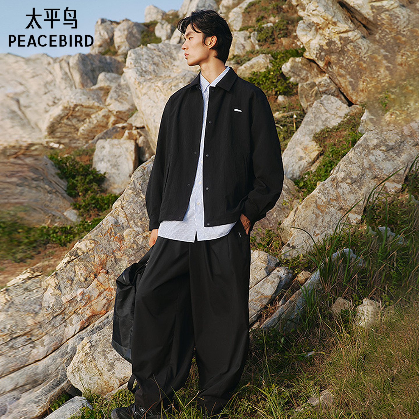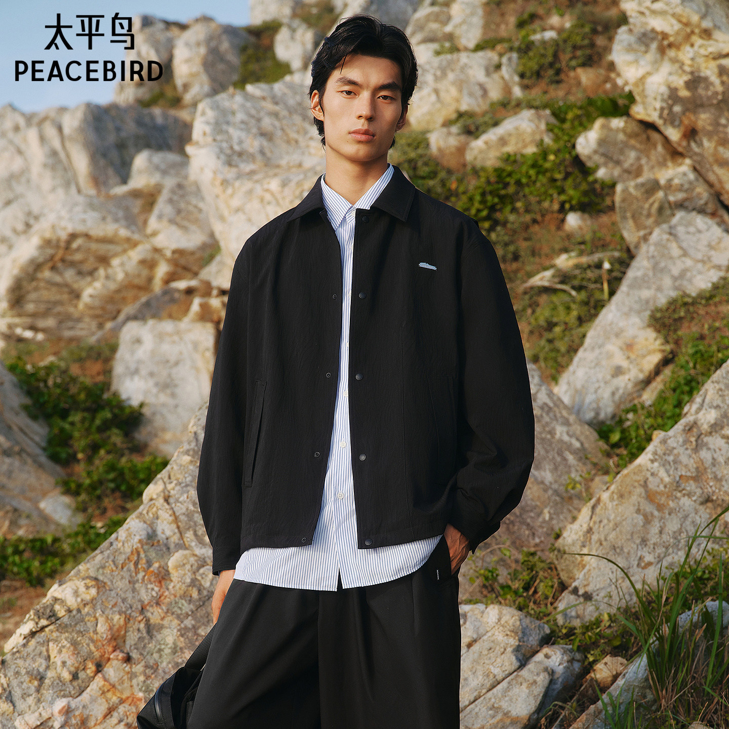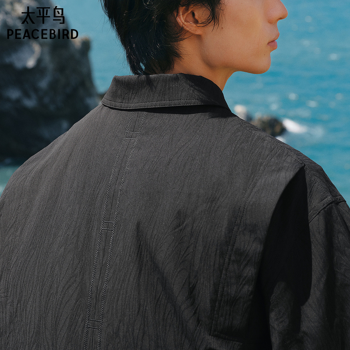 太平鸟男装 休闲夹克男士时尚舒适潮流肌理面料翻领黑色夹克潮