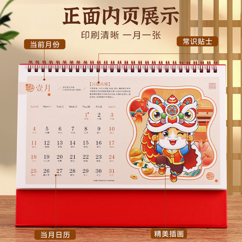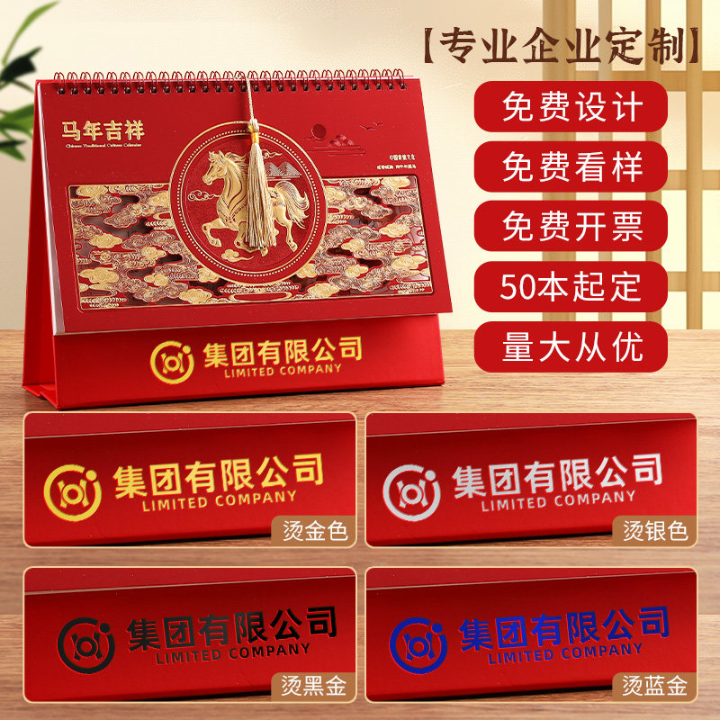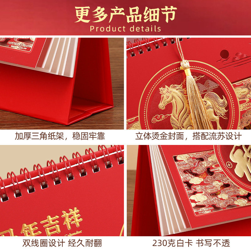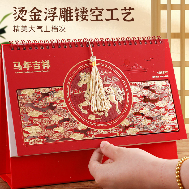 2026年新款台历中国风古典复古腰封流苏月历办公室桌面日历浮雕马年台历中国红创意日历高档订做定制企业年会