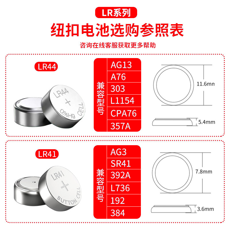 LR44纽扣电池AG13/A76 L1154 357a电子手表玩具遥控器计算机sr44wh小型号1.5v伏碱性通用式游标卡尺