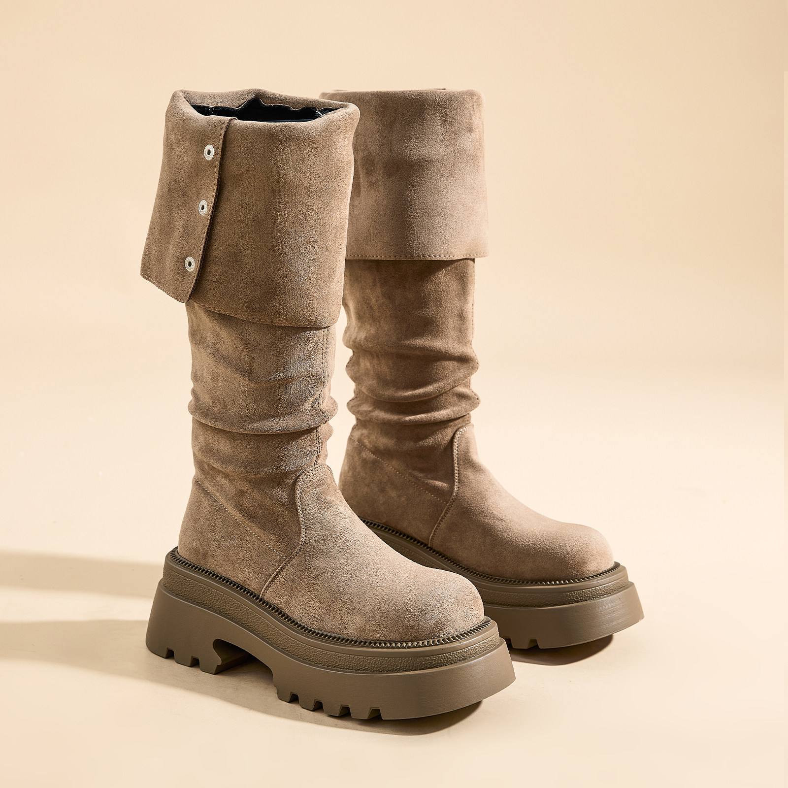羊皮版~内增高靴子女2025新款爆款中筒粗跟短靴卡其色褶皱堆堆靴