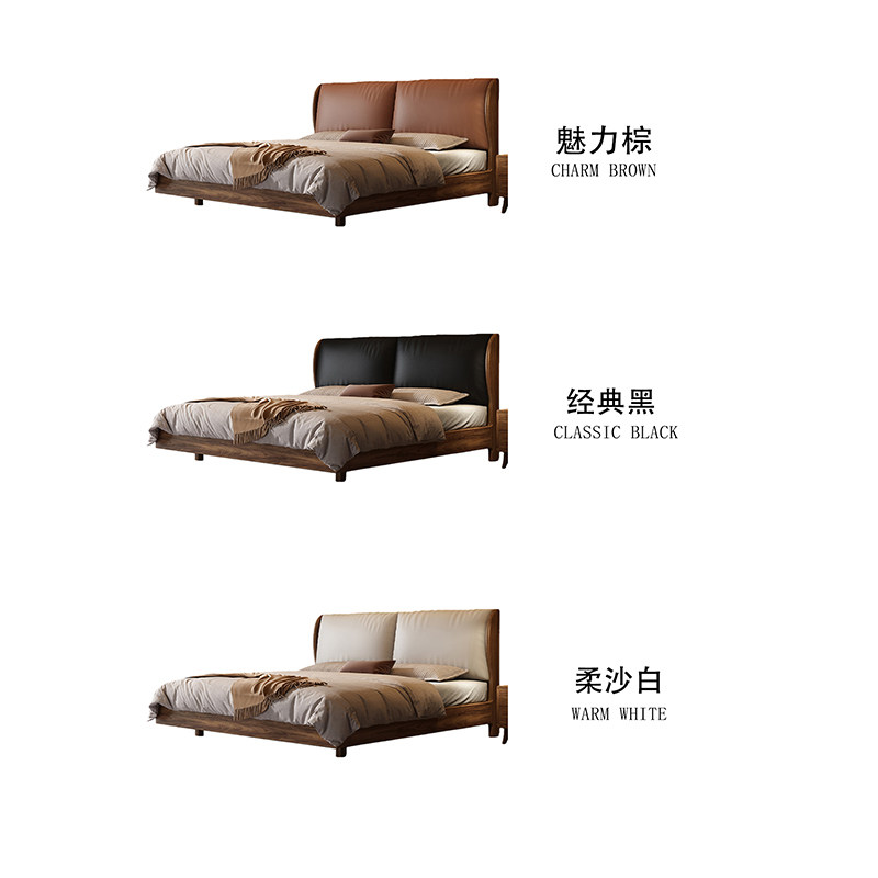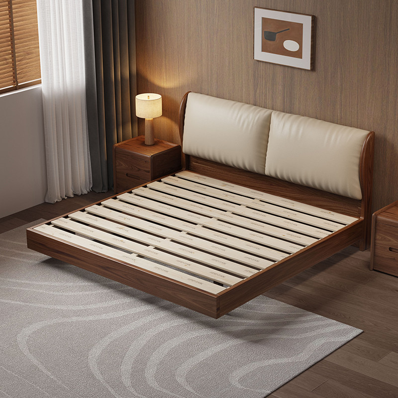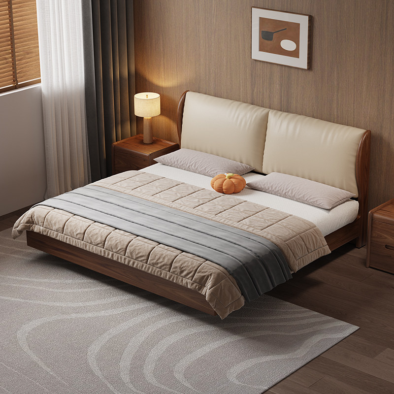 宋氏美学实木床卧室家用现代轻奢黑胡桃木双人床真皮软包悬浮大床