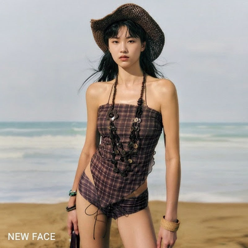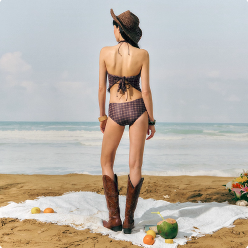 女游泳衣小胸分体复古格子系绳三点式分体比基尼小胸温泉泳装性感