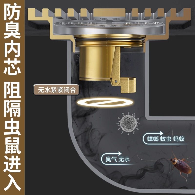 浴室全铜防臭地漏卫生间洗衣机通用下水防返臭神器黄铜方形加长