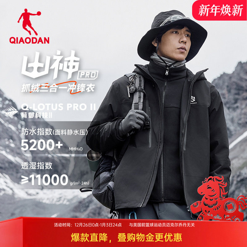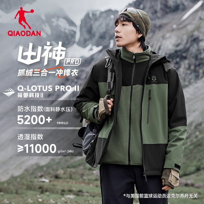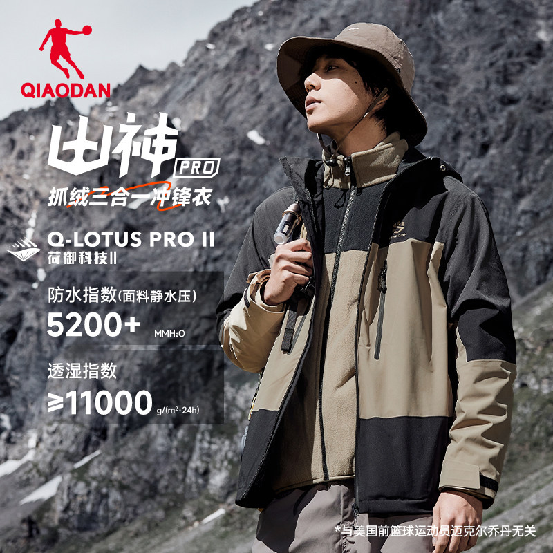 乔丹山神运动服外套男款三合一防泼水夹克两件套加绒户外登山风衣