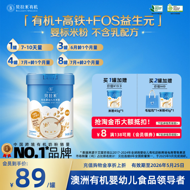 【U】【老爸抽检品质之选】贝拉米无奶有机高铁米粉婴儿低敏宝宝
