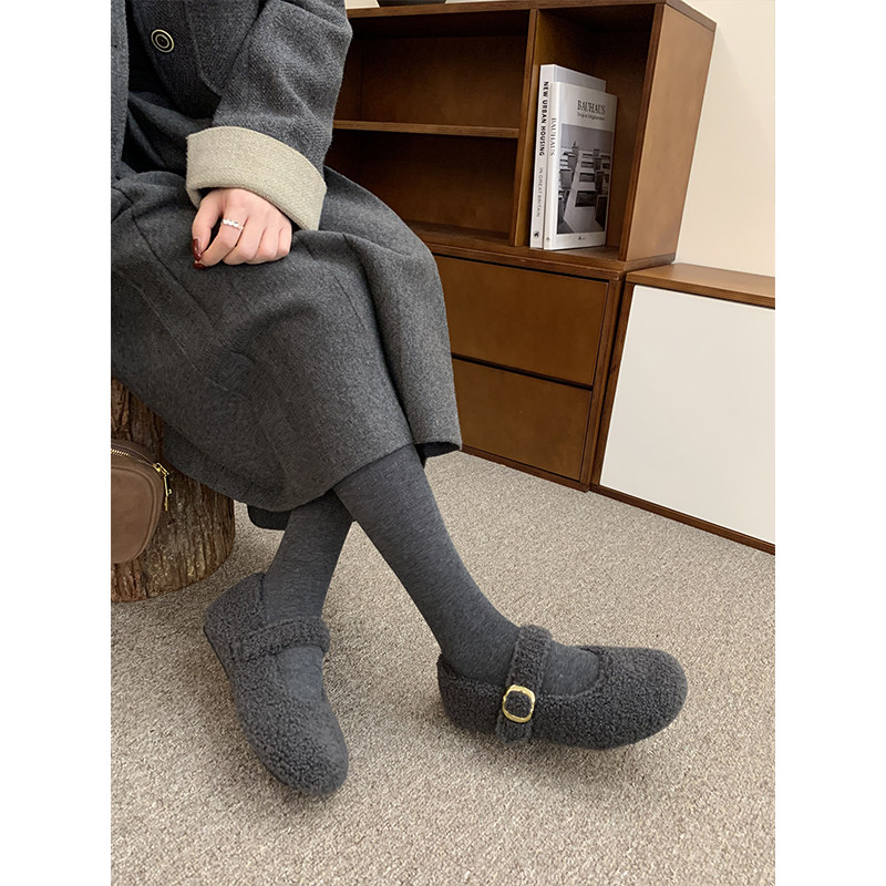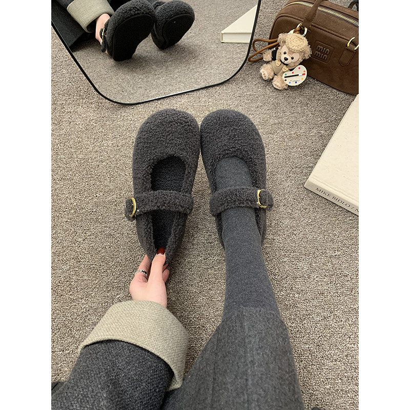 灰色玛丽珍毛毛鞋女冬外穿新款呢子单鞋女平底加绒鞋子浅口圆头