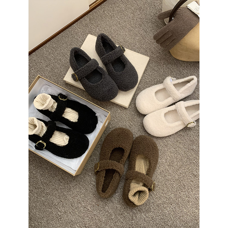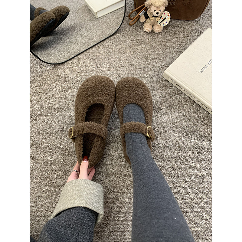 羊皮版复古玛丽珍鞋女方头秋冬季加绒保暖毛毛棉鞋平底晚晚单鞋女