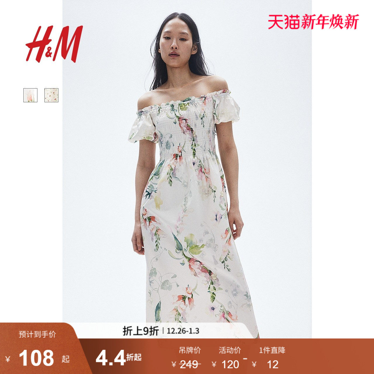 HM女装花卉连衣裙冬季花朵泡泡一字肩短袖植物印花长裙1230970